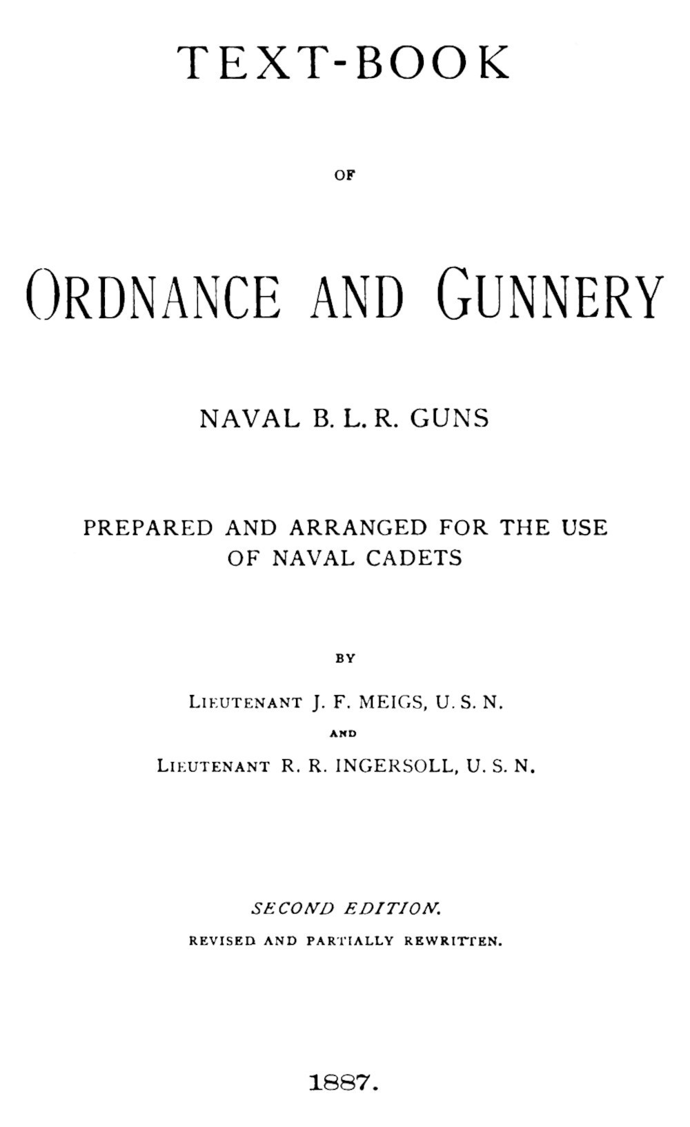 Za autorami: "Tom ten, przygotowany jako podręcznik dla kadetów marynarki wojennej, do ograniczonego kursu uzbrojenia i artylerii, nie powinien być traktowany jako kompletny traktat na tematy poruszone w kilku rozdziałach. Ma on na celu uzupełnienie instrukcji wywodzących się z innych podręczników używanych w kursie oraz zaspokojenie szczególnego zapotrzebowania w Akademii Marynarki Wojennej. Znaczna część tematu została zaczerpnięta z następujących źródeł: Proceedings U.S. Naval Institute, Proceedings Royal Artillery Institution, Publications of Office of Naval Intelligence, Ordnance Notes U.S. Army, Cooke's Naval Ordnance and Gunnery oraz oficjalne raporty Honorowego Sekretarza Marynarki Wojennej. Brak miejsca i czasu na nauczanie uniemożliwia przedstawienie czegoś więcej niż zarys kilku ważnych tematów, a student jest kierowany do specjalnych prac na te tematy w celu dalszego omówienia i uszczegółowienia."