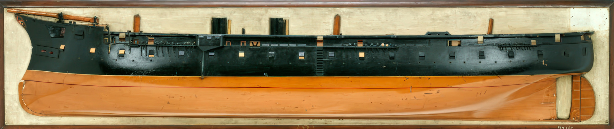 | Bateria | Na śródokręciu 140 mm (5,5 in) zmniejszający się na dziobie i na rufie do 114 mm (4,5 in) na podkładzie z 152 mm (6 in) drewna |