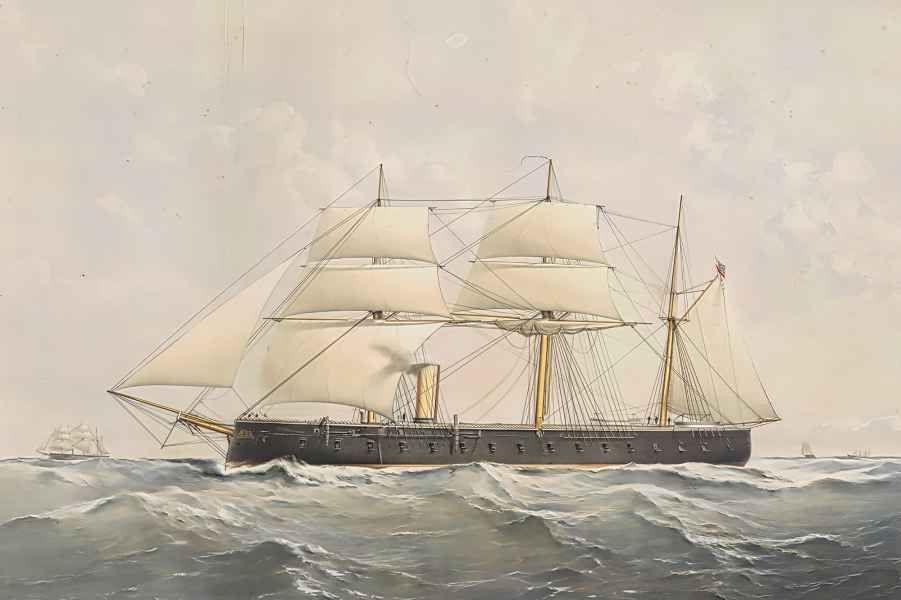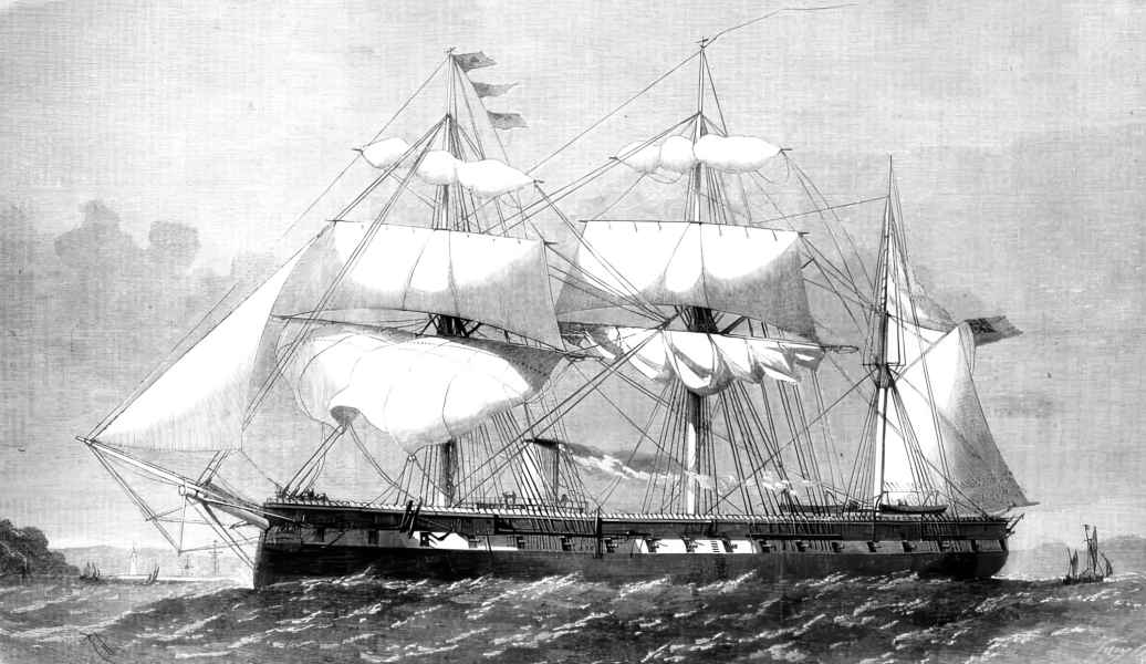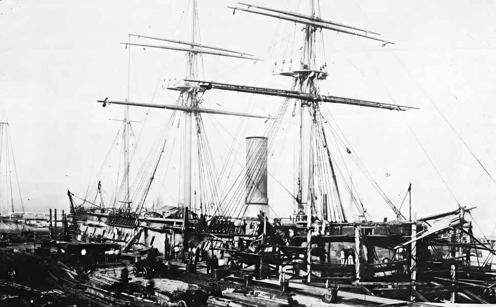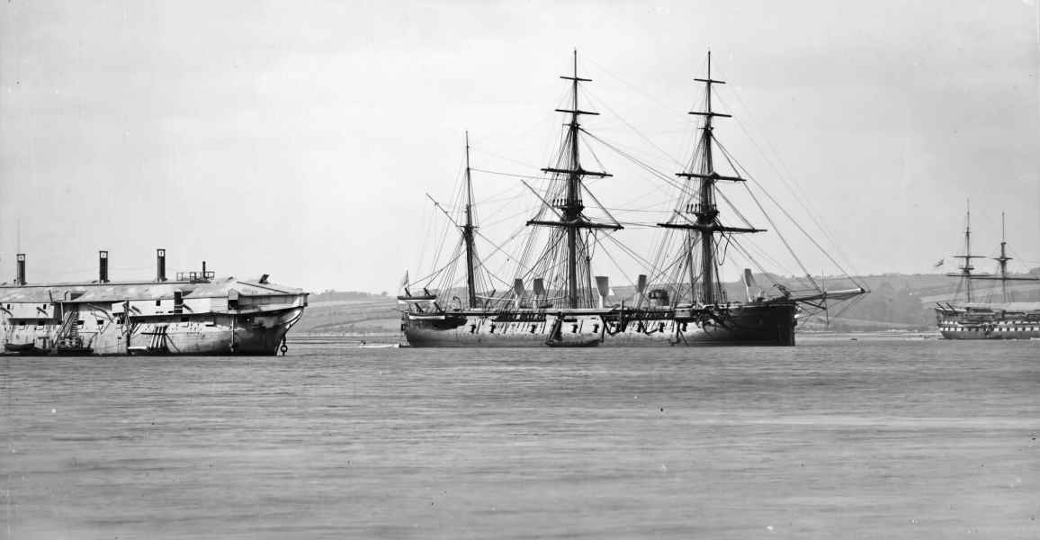 Zdjęcie z 1866 r. Okręt ma opuszczone kominy i otwarte wywietrzniki w celu poprawienia wentylacji. Z zasobów Imperial War Museums.