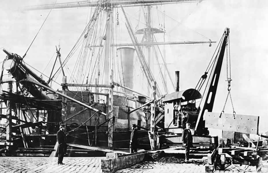 Zdjęcie przedstawiające budowę okrętu w stoczni Chatham, na początku 1863 r.