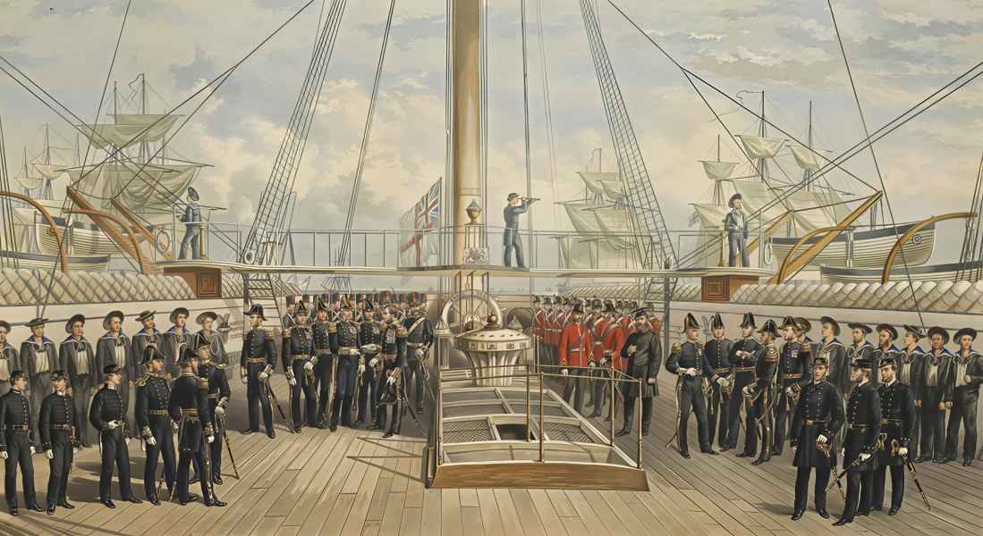 Grafika zatytułowana " Royal Navy. Poświęcone admirałowi Sir Thomasowi Sabrine Pasleyowi... z H.M.S. The Royal Oak" datowana na 1869 r. Z zasobów National Maritime Museum, Greenwich, Londyn.