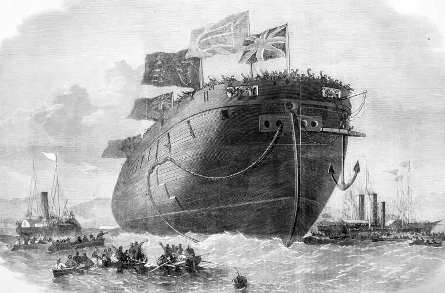 Rysunek z Illustrated London News z dnia 20 września 1862 r. przedstawiający moment wodowania okrętu.