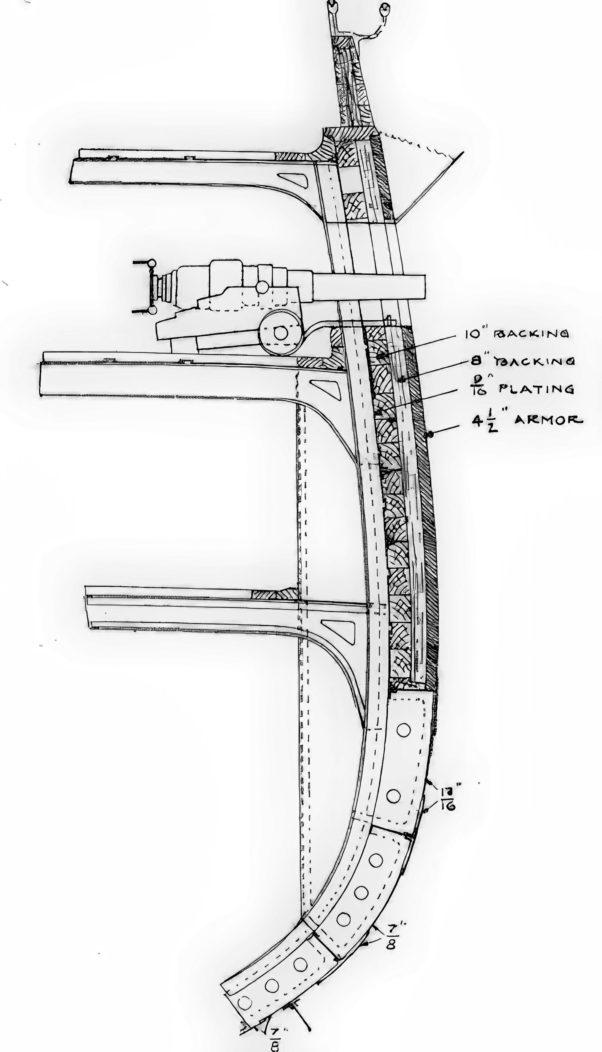 | Burty | 114 mm (4,5 in) na podkładzie z 457 mm (18 in) drewna tekowego |
