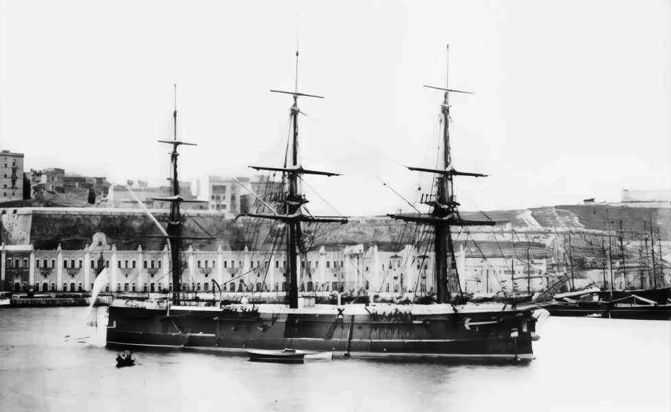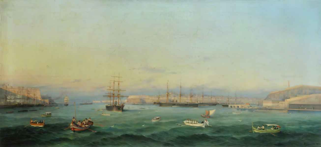 Obraz namalowany przez Giancinto Gianni, przedstawiający Flotę Śródziemnomorską na Malcie, czerwiec 1876 r. Od lewej HMS "HELICON", "SWIFTSURE", "PALLAS", "HERCULES" i "INVINCIBLE" w porcie.