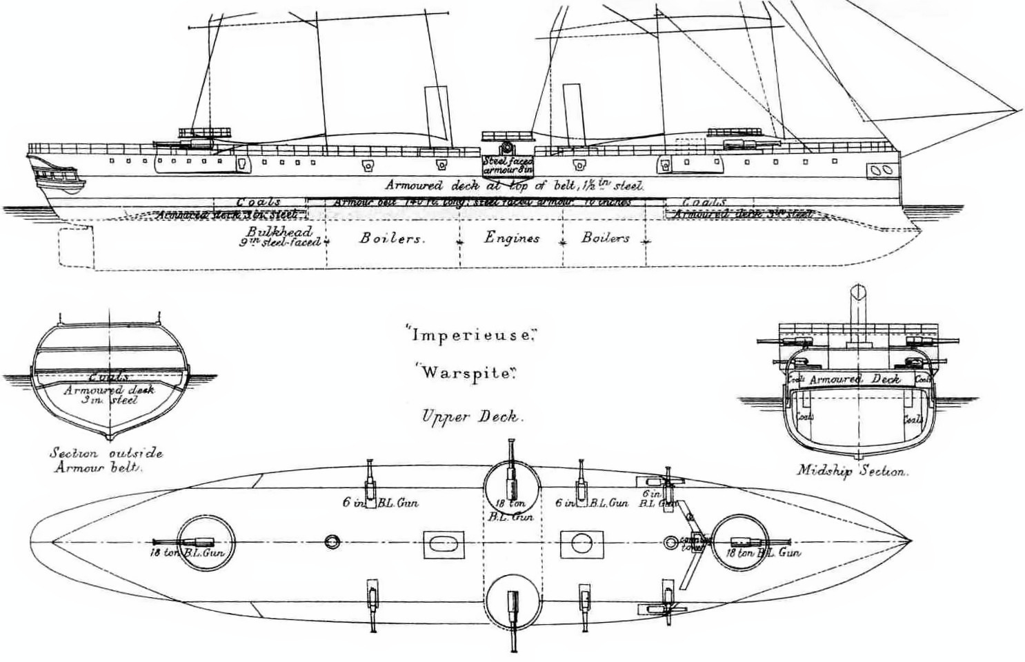 | WARSPITE | Chatham DYd | 25.10.1881 | 29.01.1884 | ?.06.1888 | Sprzedany na złom 04.04.1905 r. |