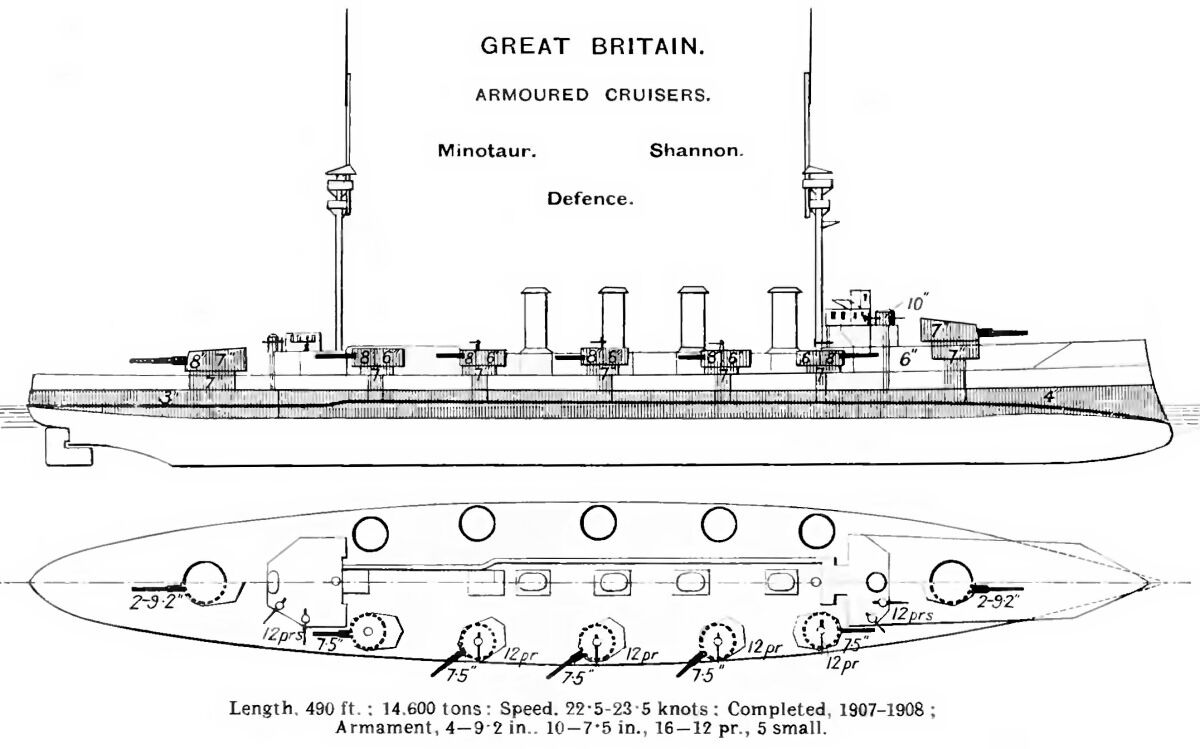 Wyporność normalna okrętów wynosiła 14 600 ts, natomiast pełna 16 630 ts. Długość całkowita okrętów wynosiła 158,19 m (519 ft 0 in) natomiast długość między pionami 149,35 m (490 ft 0 in). Jeżeli chodzi o szerokość i zanurzenie to dla "MINOTAUR" i "DEFENCE" szerokość wynosila 22,71 m (74 ft 6 in), natomiast zanurzenie 7,92 m (26 ft 0 in). Jeżeli chodzi o HMS "SHANNON" to postanowiono przeprowadzić eksperyment, aby ocenić wpływ proporcji wymiarów na prędkość okrętu. "SHANNON" był o stopę szerszy i miał o stopę mniejsze zanurzenie średnie. Ostatecznie okazało się iż był najwolniejszym z całej trójki. Wysokość metacentryczna okrętów przy normalnej wyporności wynosiła 0,93 m (3,05 ft), natomiast dla wyporności pełnej 0,99 m (3,25 ft). Okręty był zaprojektowany dla załogi o liczebności 779 marynarzy, jednak w latach 1908 - 1912 na okręcie znajdowało się od 802 do 842 członków załogi. Około 1909 r. podniesiono wszystkie kominy o 4,57 m (15 ft), gdyż okazały się za krótkie i zadymiały stanowisko dowodzenia. W 1916 r. do masztu głównego zostały dodane podpory gdyż nowe, planowane do zamontowania urządzenia do kierowania ogniem miały znacznie większą wagę. Urządznia te zostały zamontowane na ocałaych krążownikach dopiero w latach 1917/1918. W ostatnim roku wojny, dziobowy maszt został wymienony na całkiem nową, trójpodporową konstrukcję.