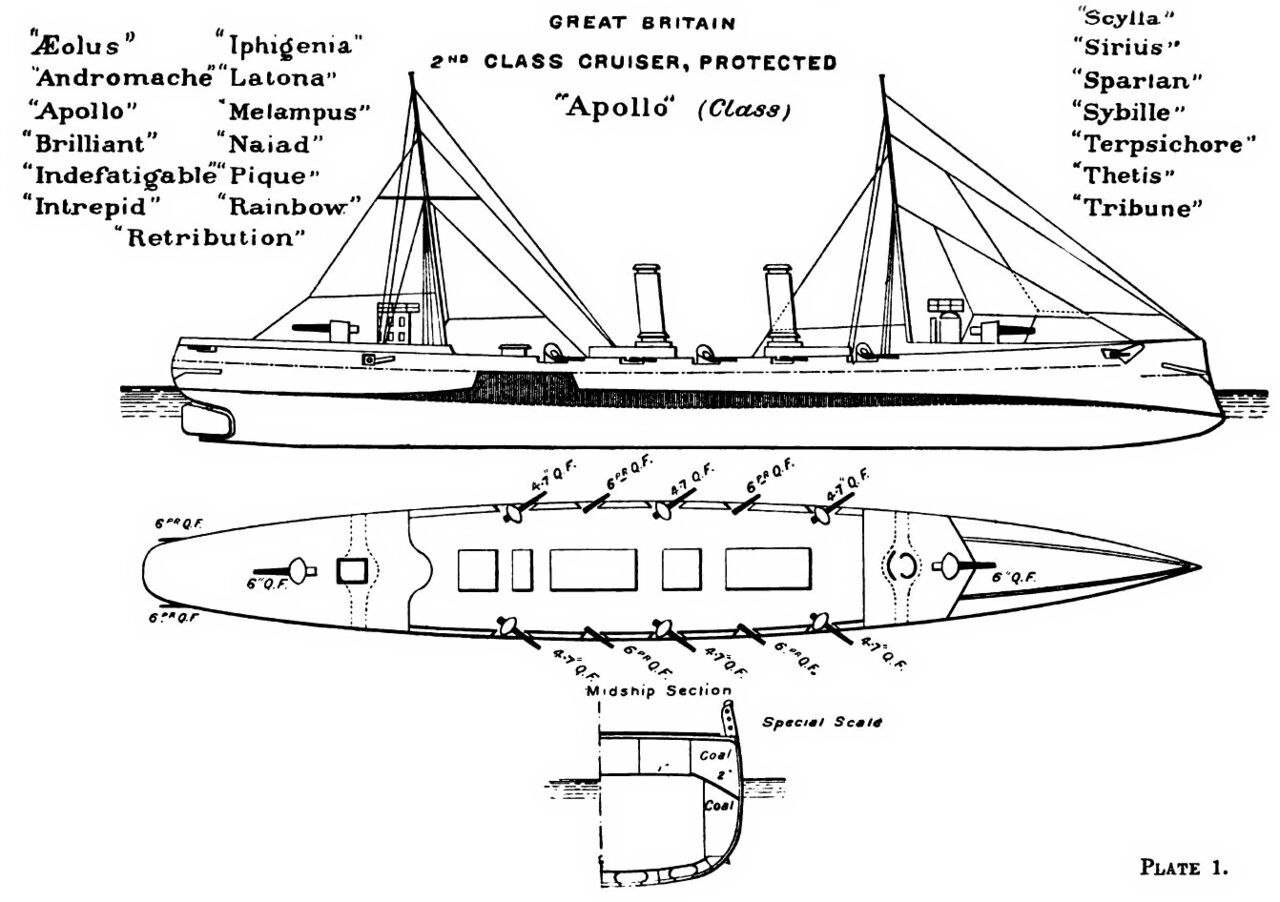 Typ "APOLLO" był to liczny, liczący 21 jednostek typ krążowników pancernopokładowych II klasy zbudowanych na podstawie Naval Defence Act z 1889 r. Konstrukcyjnie był oparty o powiększony projekt krążowników pancernopokładowych typu "MEDEA", z uzbrojeniem składającym się wyłącznie z dział szybkostrzelnych (QF). |