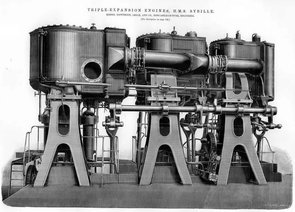 | Maszyny | Dwie 3-cylindrowe, pionowe maszyny parowe o cylindrach podwieszonych potrójnego rozprężania; 3 dwustronne i 2 jednostronne kotły cylindryczne, 2 śruby |