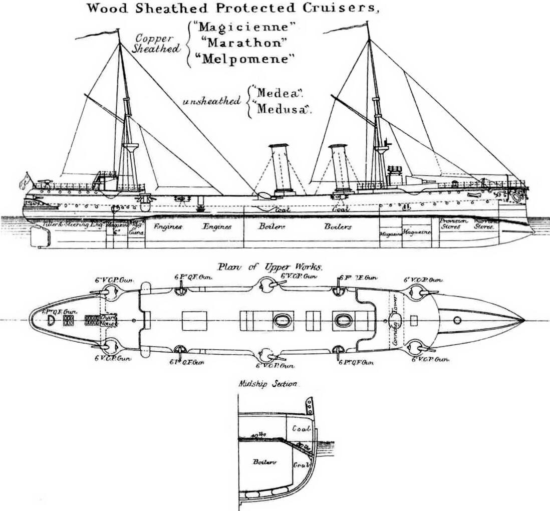 Krążowniki pancernopokładowe typu "MEDEA" zostały zamówione w Programie Rozbudowy Floty na lata 1886 - 1887 i były początkowo klasyfikowane jako krążowniki II klasy, jednak jeszcze w trakcie budowy zostały przeklasyfikowane na krążowniki III klasy. Konstrukcyjnie stanowiły pomniejszoną wersję krążowników typu "MERSEY", będąc od nich słabszymi w każdym aspekcie. Trzy z nich: "MAGICIENNE", "MARATHON" i "MELPOMENE" zostały wyposażone w pokrycie stalowego kadłuba wykonane z drewna i miedzi.