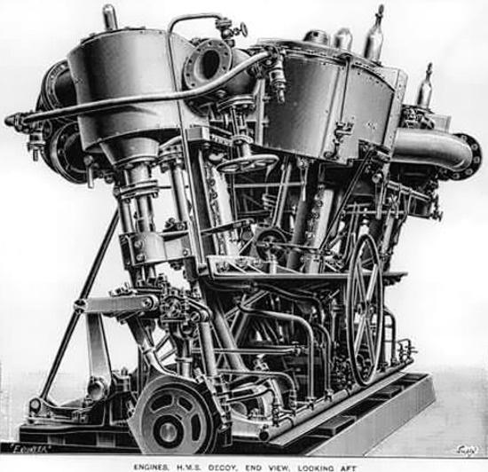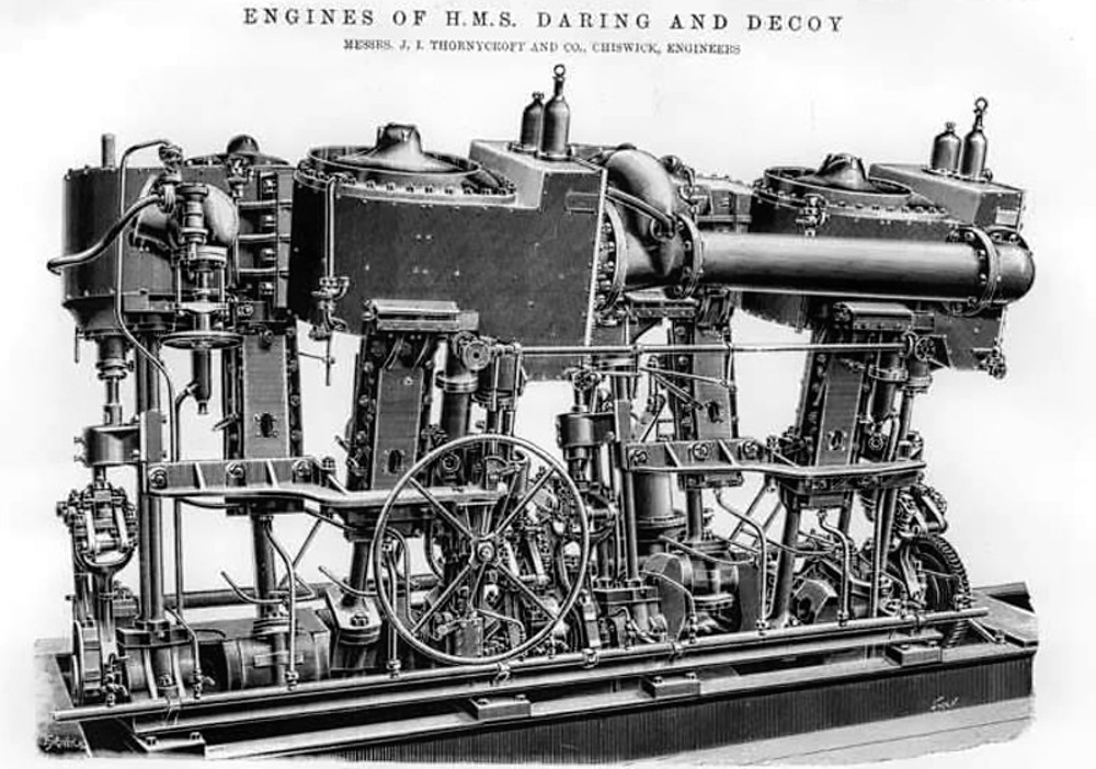 Okręty zostały wyposażone w dwie 4-cylindrowe pionowe maszyny parowe o cylindrach podwieszanych potrójnego rozprężania, z których dwa były niskiego ciśnienia, ale o mniejszych średnicach. Firma Thornycroft w przeciwieństwie do stoczni Yarrow nie eksperymentowała z napędem, stawiając na najefektywniejszy ich zdaniem zestaw, gdyż jednym z bardzo ważnych zaleceń planów konstrukcyjnych było osiągnięcie 26 węzłów (z tego też powodu pierwsze sześć prototypowych niszczycieli które miały spełniać ten warunek nazywano 26-węzłowcami ("26-knotters"). Maszyny były zaopatrywane w parę przez trzy kotły wodnorurkowe wyprodukowane przez Thornycroft, wypracowujące parę o ciśnieniu 215 psi (w porównaniu do 185 psi w kotłach stoczni Yarrow, zamontowanych w HMS "HORNET", czy 200 psi w kotłach francuskiej firmy Normand, zamontowanych przez stocznie Laird w prototypowych niszczycielach typu "FERRET"). Dwa pierwsze odprowadzały spaliny przez jeden komin, nieco szerszy od drugiego, rufowego. Planowano osiągnąć moc 4200 ihp i prędkość 27 węzłów, jednak na próbach HMS "DECOY" (lub "DARING" - źródła często podają oba okręty przypisując im te same wyniki) osiągnął 4644 ihp i 28,25 węzła. Okręty wyposażono również w opatentowany wynalazek Thornycroft - podwójny ster. HMS "DARING" na próbach morskich 19 lipca 1894 r. osiągnął na mili pomiarowej w Maplin Sands nieopodal Southend prędkość 28,21 węzła. Pomiary spalania węgla dla tego samego okrętu wykazały iż na jednej tonie paliwa na jeden kocioł, okręt może przepłynąć niemal 38 mil morskich przy prędkości 10 węzłów.