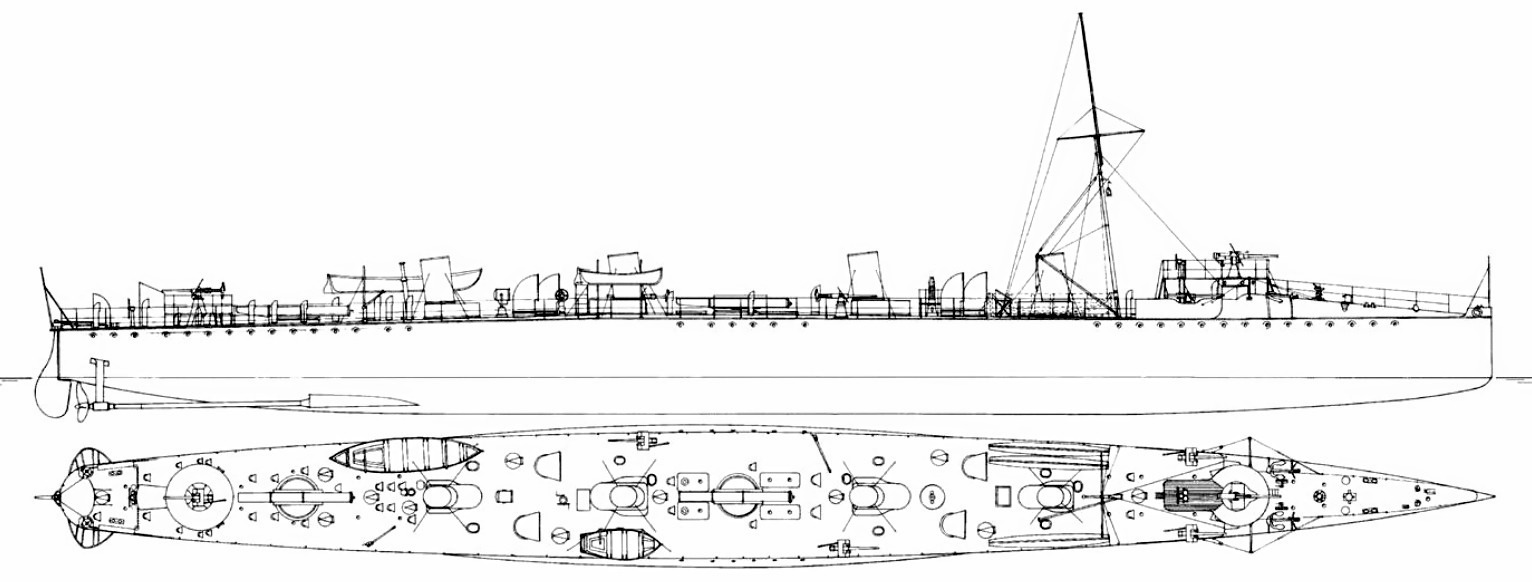 | Początkowe | 1 działo 76 mm (3 in) 12-funtowe (12 pdr) 12 cwt QF; 5 dział 57 mm (2,24 in) 6-funtowych (6 pdr) 8 cwt QF; 2 wyrzutnie torped 450 mm (17,72 in) |