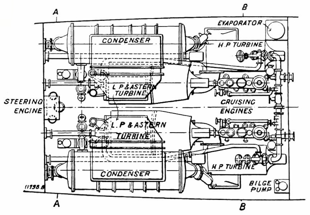 | Maszyny | Cztery turbiny parowe Parsons; 2 pionowe maszyny parowe o cylindrach podwieszanych potrójnego rozprężania; 4 kotły wodnorurkowe firmy Yarrow; 12 śrub |