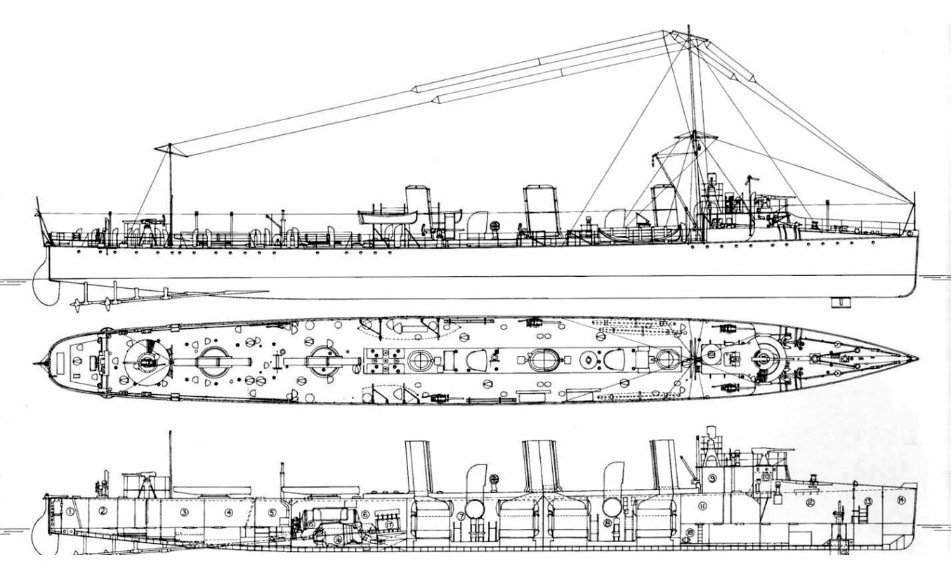 | Początkowe | 1 działo 76 mm (3 in) 12-funtowe (12 pdr) 12 cwt QF; 5 dział 57 mm (2,24 in) 6-funtowych (6 pdr) 8 cwt QF; 2 wyrzutnie torped 450 mm (17,72 in) |