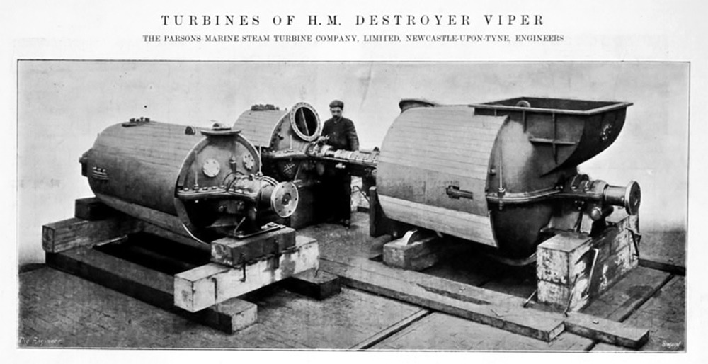 Główną różnicę w porównaniu do niszczycieli 30-węzłowych stanowił napęd, składający się z czterech turbin parowych, poruszających bezpośrednio cztery wały napędowe. Parę do turbin dostarczały cztery kotły wodnorurkowe typu Yarrow z wymuszonym obiegiem wody, umieszczone w dwóch kotłowniach. Spaliny z kotłowni odprowadzane były przez trzy kominy, z czego środkowy odprowadzał spaliny z dwóch kotłów. Na każdym z wałów napędowych znajdowały się po dwie śruby o małej średnicy, aby pochłaniać moc bez kawitacji przy wysokich obrotach turbiny. Do wałów wewnętrznych dołączone były dodatkowe turbiny do biegu wstecznego, dlatego też w odróżnieniu od innych niszczycieli nie mógł używać śrub w celu sterowania okrętem. Podczas oficjalnej próby zużycia węgla, 16 sierpnia 1900 r., HMS "VIPER" osiągnął prędkość 31,017 węzłów przy 951,21 obr/min (liczba obrotów na minutę była niemal dwukrotnie większa niż w przypadku typowego niszczyciela 30-węzłowego). Szacowana moc wyjściowa (nie było wtedy dynamometru na pokładzie) sięgała 8400 ihp. Wyporność przy wyjściu na próby wyniosła 385 ts. 31 sierpnia 1900 r. HMS "VIPER" osiągnął średnią prędkość 33,57 węzłów przy 1046,11 obr / min, przy wyporności 393 ts. Później okręt podobno osiągnął średnią prędkość 36,858 węzłów przy około 12,500 ihp, co czyniło HMS "VIPER" zdecydowanie najszybszym niszczycielem na świecie w owym czasie. Ekonomia zużycia węgla była jednak słaba przy niższych prędkościach. Turbiny były sprawne tylko przy pełnej prędkości. Również śruby zostały zaprojektowane dla osiągania trzydziestu sześciu węzłów i miały tak dużą powierzchnię łopat, że wytwarzały znaczny opór przy niskiej prędkości, podobnie jak przerośnięte piasty i wsporniki wałów potrzebne do radzenia sobie z pełną mocą. Co więcej, w celu uproszczenia konstrukcji kotły Yarrow nie posiadały zwykłych rozwiązań konstrukcyjnych, stosowanych aby poprawić ekonomikę na niskich poziomach prędkość. W liście z 1900 r. Do "The Times" uzasadniającym projekt statku, Parsons wskazał na nacisk na maksymalną prędkość, natomiast problem zużycia paliwa miał być potraktowany drugorzędnie.