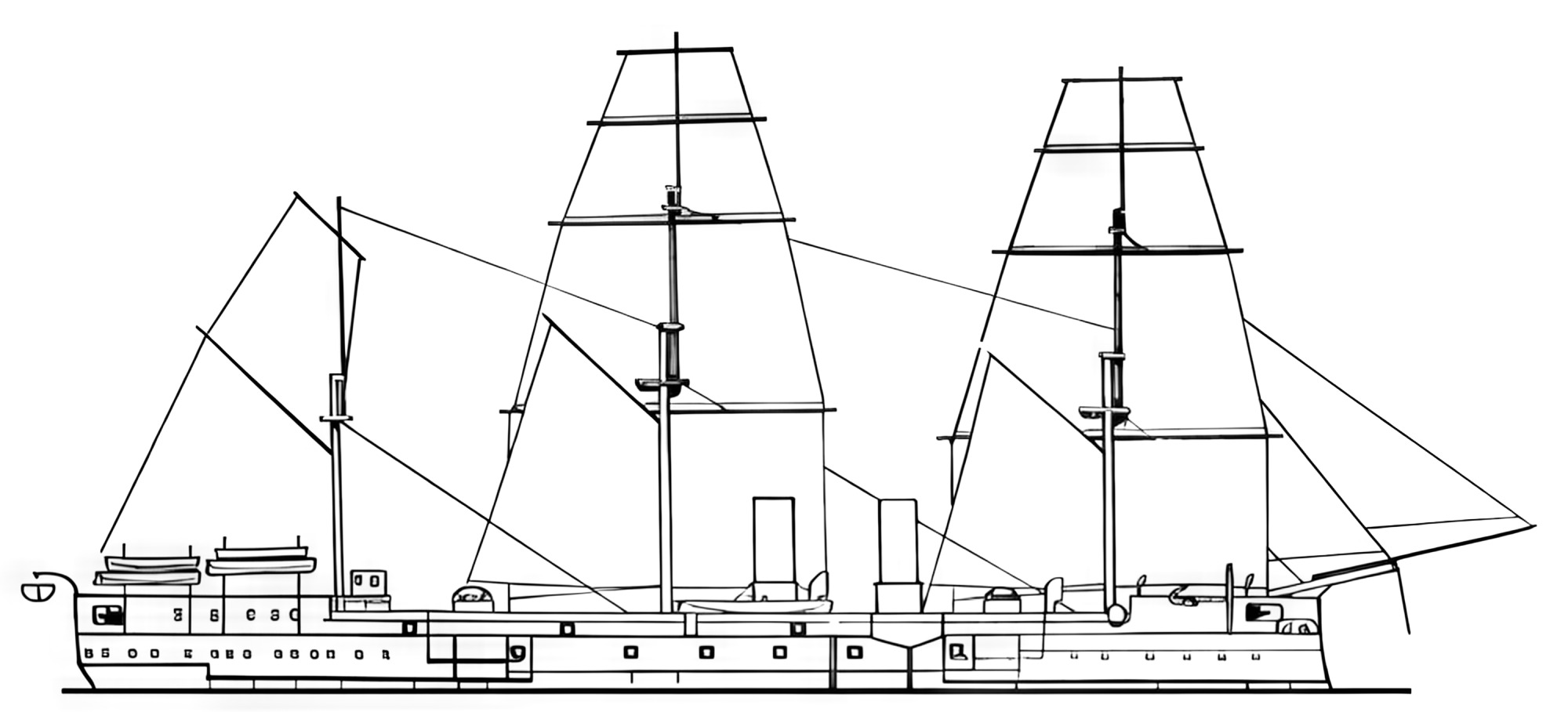 Okręt posiadał ożaglowanie typu bark o nieustalonej powierzchni. Okręt pod żaglami zachowywał się bardzo źle, w przeciwieństwie do żeglowania pod parą. Ożaglowanie zostało zdjęte podczas modernizacji w latach 1887 - 1891.