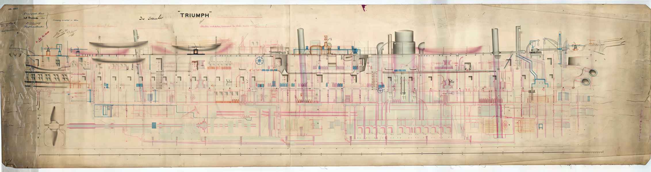 | Zasięg | 1640 mil morskich przy prędkości 10 węzłów ("TRIUMPH":1680 Mm/10 w.) |