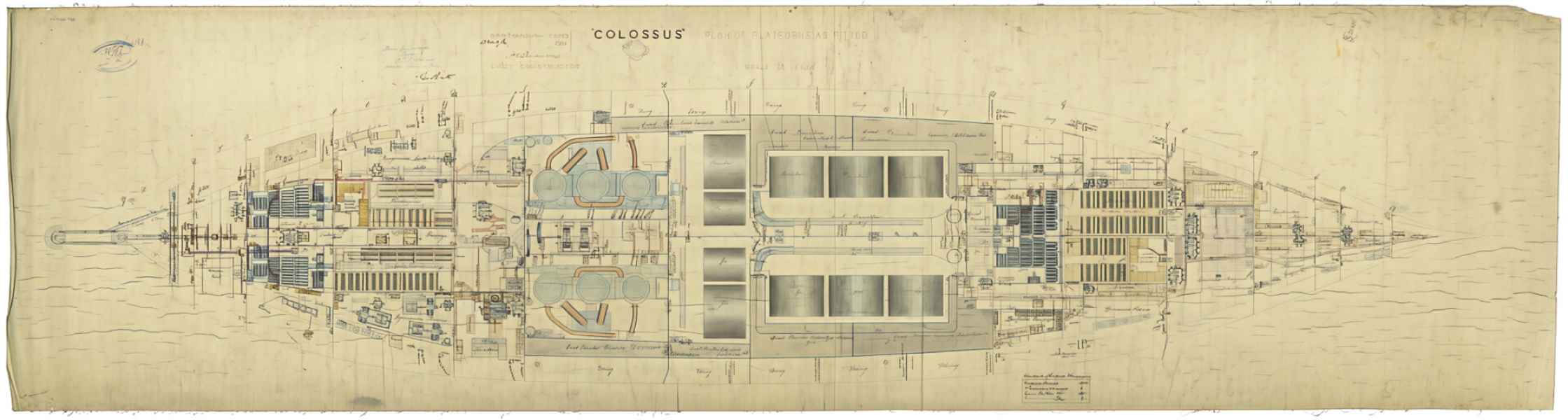 HMS "COLOSSUS" został wyposażony w dwie 3-cylindrowe pionowe maszyny parowe o podwieszanych cylindrach podwójnego rozprężania firmy Maudslay, natomiast HMS "EDINBURGH" w maszyny tego samgo typu jednak wyprodukowane przez firmę Humphreys. W maszynie parowej HMS "COLOSSUS" średnica cylindra wysokiego ciśnienia wynosiła 1,47 m (58 in), natomiast średnice dwóch mniejszych cylindrów niskiego ciśnienia wynosiły 1,88 m (74 in). Skok wynosił 0,99 m (39 in). Maszyna parowa HMS "COLOSSUS" miała moc 7488 ihp i zapewniała prędkość 16,5 węzła. Jego bliźniak miał maszyny o mocy 6808 ihp co pozwalało na osiąganie prędkości 16 węzłów. Łącznie 10 kotłów owalnych (8 głównych i 2 pomocnicze) umieszczonych w czterech kotłowniach produkowało parę o ciśnieniu 64 psi. Kotły główne miały po 3 ruszty, natomiast pomocnicze po 2. Maszyny napędzały dwie czterołopatowe śruby o średnicy 5,38 m (17 ft 8 in).