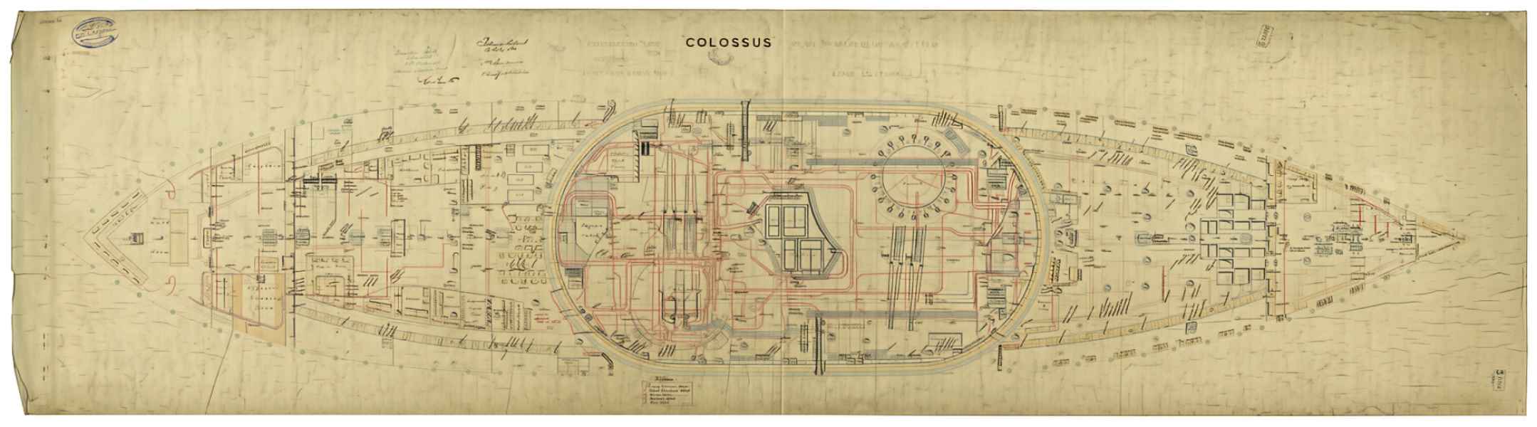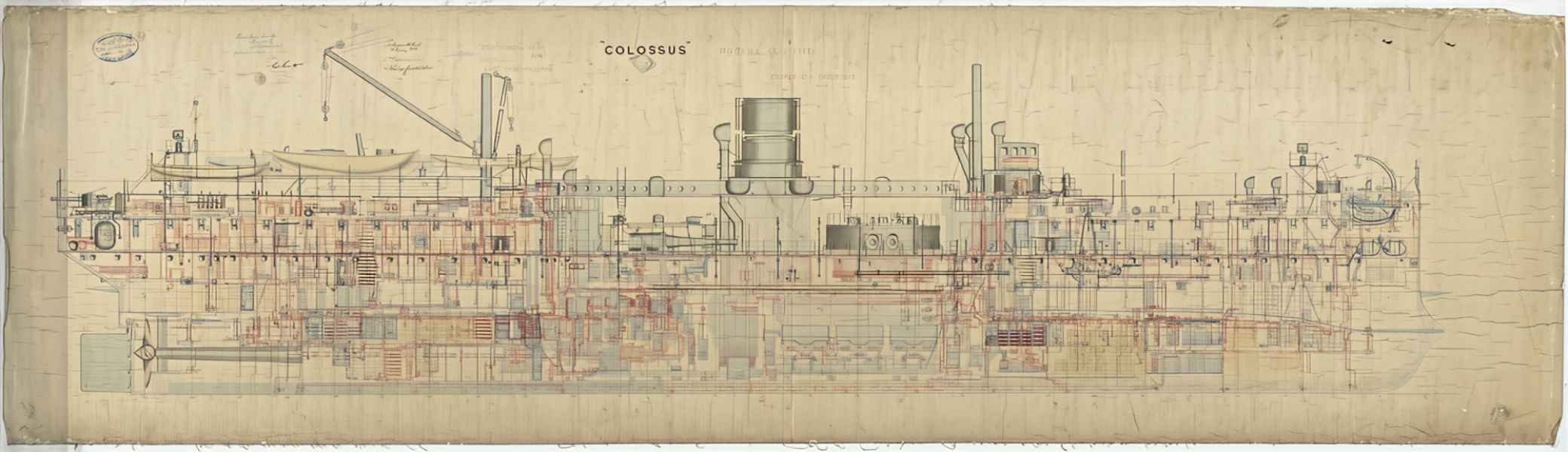 Początkowe - HMS "COLOSSUS" | 4 działa 305 mm (12 in)/25 RBL (45-ton) Mk. IV (2x2); 5 dział 152 mm (6 in) RBL (89 cwt) (5x1); 4 działa 6-funtowe (6 pdr) QF (4x1); 4 lekkie działa, 15 mitraliez, 2 wyrzutnie torped 356 mm (14 in) |