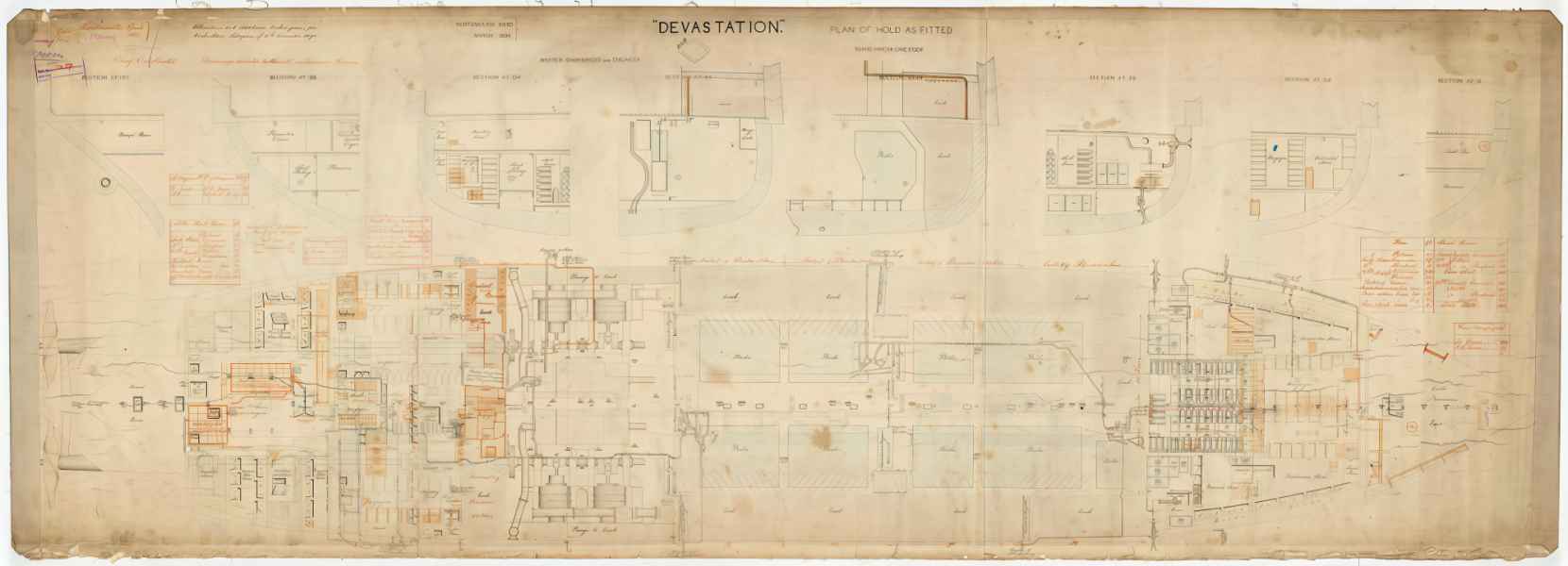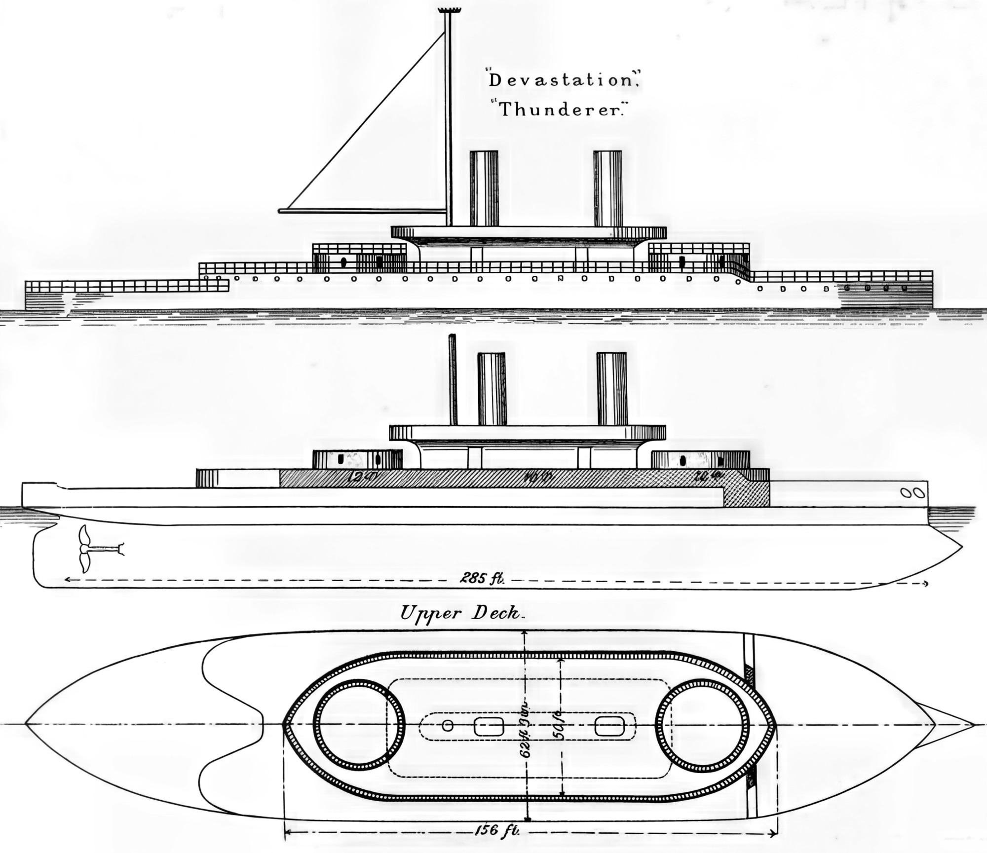 Okręty wyposażone były również w taran. HMS "THUNDERER" posiadał również początkowo dwa maszty używane jako sygnałowe i obserwacyjne. Dziobowy maszt sygnałowy, umieszczony tuż za mostkiem został zdjęty podczas modernizacji w latach 1890 - 1892. W 1871 r. przetestowano na małym 2,7 m (9 ft) modelu stabilność konstrukcji w basenie z wodą. W jakiś czas później powtórzono test dla większego - 5,5 m (18 ft) modelu. Już po zwodowaniu HMS "DEVASTATION" przeprowadzono główne testy stabilności. 400 ludzi biegających od burty do burty 18 razy wygenerowało 7-stopniowy przechył. Podczas prób morskich na pełnym morzu przy falach wysokości 6-8 m zanotowano maksymalne przechyły o wartości 14°.