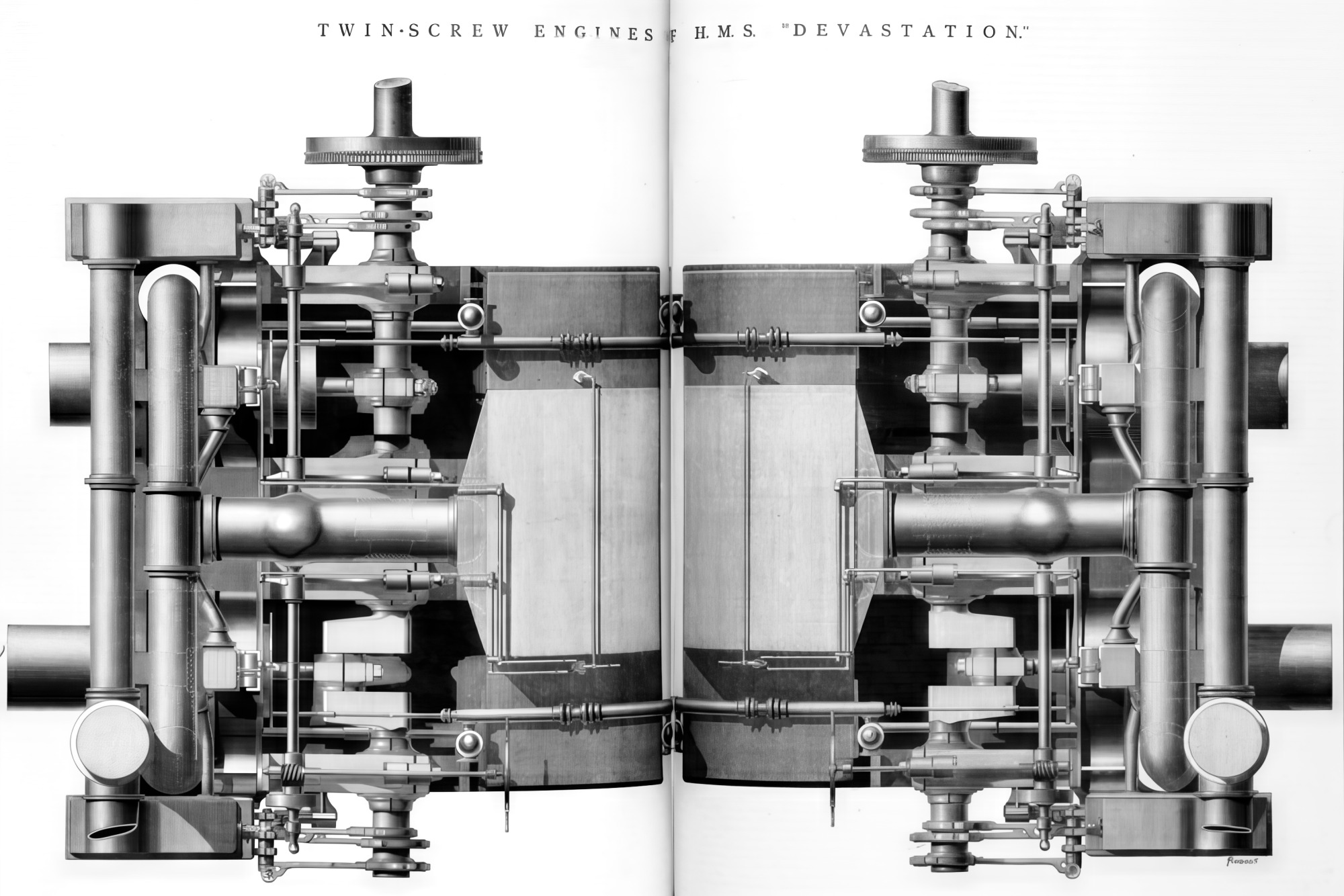 | Maszyny | Dwie 2-cylindrowe, poziome maszyny parowe tłokiem rurowym pojedynczego rozprężania firmy Penn ("THUNDERER": dwie 2-cylindrowe, poziome maszyny parowe z normalnie prowadzonymi korbowodami pojedynczego rozprężania fimry Humphreys & Tennant), 8 kotłów typu kufrowego, 2 śruby |