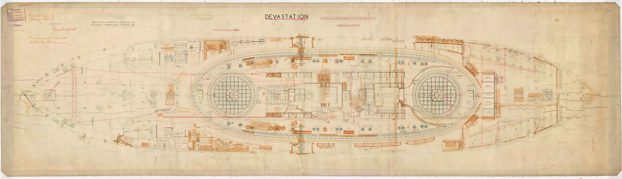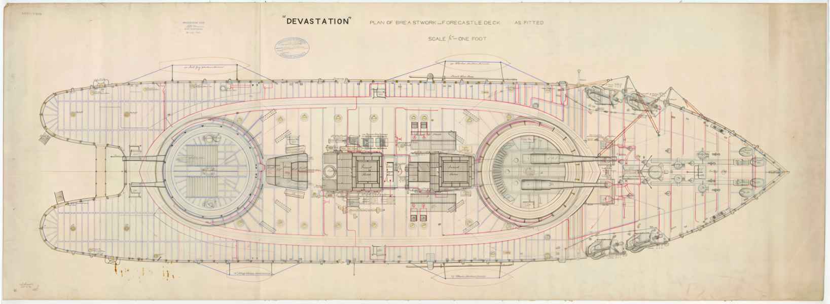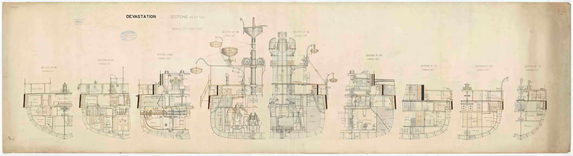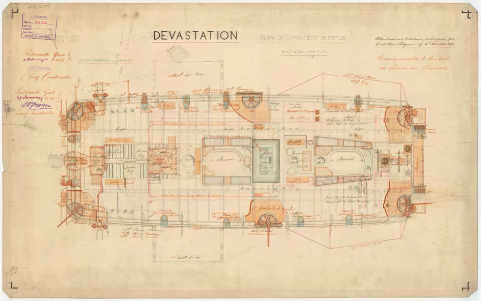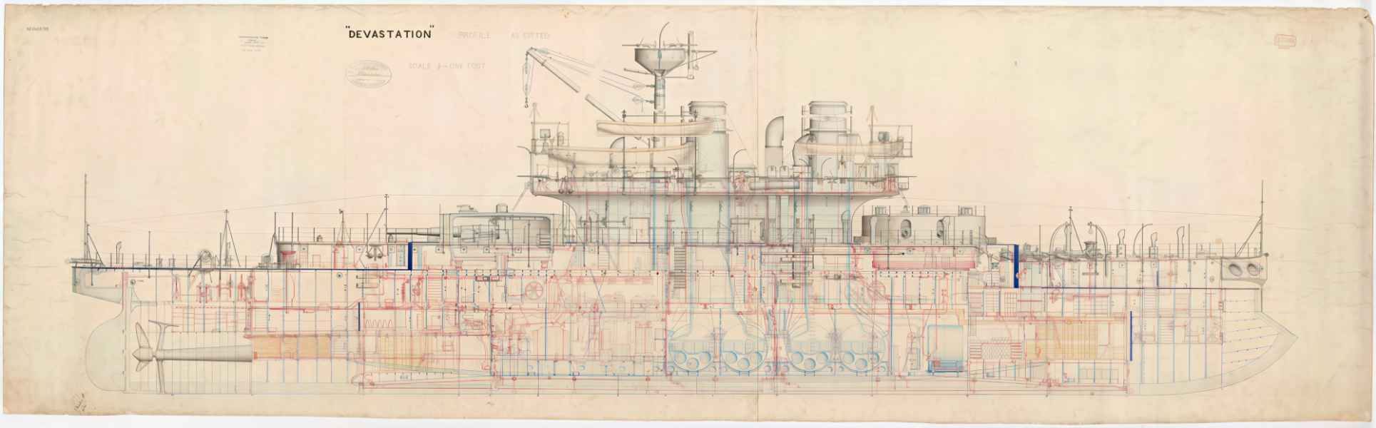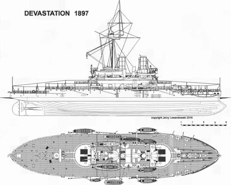 | Modernizacja w 1879 r. - HMS "DEVASTATION" | 4 działa 305 mm (12 in) MLR (35-ton) (2x2); 8 mitraliez; 2 wyrzutnie torpedowe 356 mm (14 in) |
