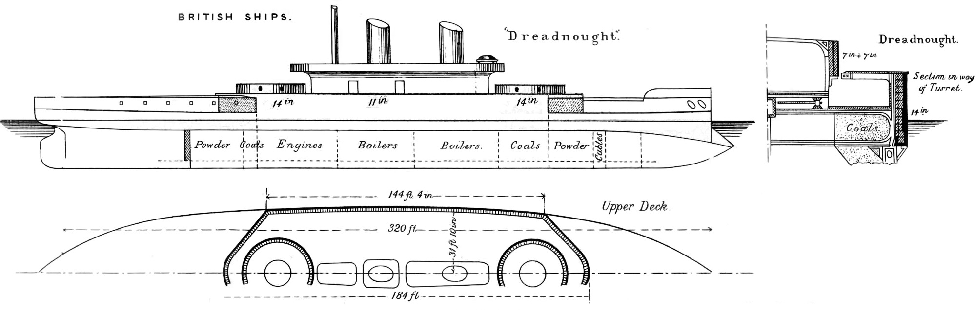 HMS "DREADNOUGHT" był powiększoną wersją pancerników wieżowych typu "DEVASTATION", z zamontowanymi mocniejszymi maszynami oraz z całkowicie opancerzonym dziobem. Projekt okrętu rozpoczął Edward Reed w 1870 r., natomiast dokończył Nathaniel Barnaby i William White w 1872 r. |