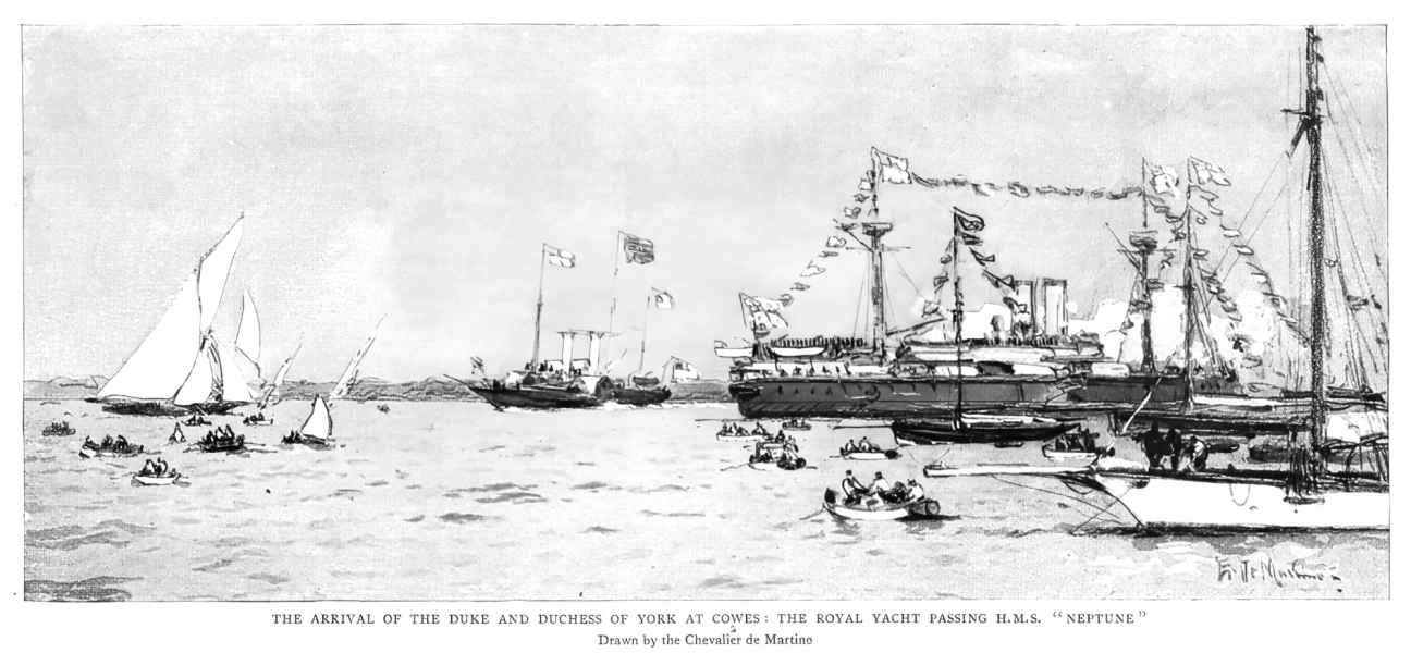 Przybycie Księcia i Księżnej Yorku do Cowes, Jacht Królewski mijający HMS "NEPTUNE". Ilustracja dla The Graphic, 12 sierpnia 1893.
