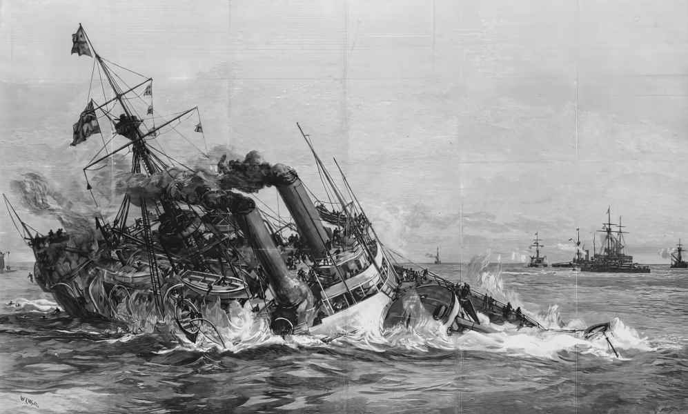 | 22.06.1893 | Okręty Floty Śródziemnomorskiej uczestniczące w manewrach opuściły port w Bejrucie. Brytyjskie okręty płynęły w szyku torowym wzdłuż wybrzeża Libanu. Przy rozwijanej prędkości około 8 węzłów, przewidywano przybycie na miejsce około 16.30. Admirał Tryon postanowił wykorzystać podejście na kotwicowisko do przeprowadzenia skomplikowanego manewru obydwu dywizjonów. Miał on polegać na ich równoczesnym zawróceniu dwóch płynących równolegle kolumn, poprzez ich zwrot ku sobie przy odległości pomiędzy liniami wynoszącej zaledwie sześć kabli i po przejściu na kontrkurs podejściu parami w rejon planowanego postoju. Dowódca zakomunikował o swym zamiarze kilku oficerom na naradzie zwołanej wczesnym popołudniem. Jeden z jej uczestników, komandor porucznik Thomas Hawkins-Smith zwrócił mu uwagę, że odległość pomiędzy dywizjonami jest zbyt mała i nie uwzględnia promienia skrętu jednostek, którego suma dla dwu okrętów flagowych wynosiła ponad dziewięć kabli. Pomimo tych obiekcji, admirał wydał w obecności dowódcy okrętu rozkaz, potwierdzający odległość sześciu kabli.