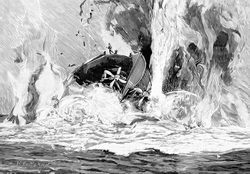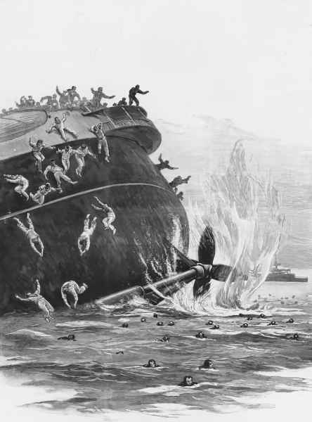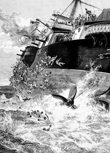 Dywizjony pancerników zaczęły przygotowania do manewru około 14.20. Większość oficerów miała wątpliwości dotyczące odległości w szyku, ale spodziewali się raczej jakiegoś szczególnego rozkazu, komplikującego ich działanie, niż błędu dowódcy. Ponadto apodyktyczny styl dowodzenia admirała Tryona i pojecie dyscypliny wpojone oficerom Royal Navy utrudniały jakiekolwiek komentarze. Pierwszą (prawą) kolumnę prowadziła HMS "VICTORIA", za nią płynęły kolejno: pancerniki "NILE", "DREADNOUGHT", "INFLEXIBLE" i "COLLINGWOOD" oraz krążownik "PHAETON". Druga kolumna, lewa, prowadzona przez kontradmirała Markhama na HMS "CAMPERDOWN" składała się kolejno z pancerników "EDINBURGH" i "SANS PAREIL" oraz zamykających ją krążowników "EDGAR" i "AMPHION". O 15.25, będąc na wysokości kotwicowiska, admirał Tryon rozkazał podnieść na swoim pancerniku zestaw flag nakazujący wszystkim okrętom zaplanowaną zmianę kursu. Ponieważ kod flagowy nie przewidywał jednego sygnału dla takiego manewru, prawa kolumna otrzymała rozkaz zwrotu o 16 rumbów (180°) w lewo, lewa kolumna o 16 rumbów w prawo. Wszystkie jednostki oprócz HMS "CAMPERDOWN" potwierdziły odczytanie i zrozumienie sygnału. Ten ostatni uczynił to dopiero sześć minut później, gdy zespoły zbliżyły się znacznie do brzegu. Było to spowodowane wątpliwościami admirała Markhama, który obawiając się błędu nawigacyjnego przy wykonywaniu manewru zamierzał poprosić za pośrednictwem alfabetu semaforowego o wyjaśnienie sygnału. Jednak, ponaglony kolejnym zapytaniem z okrętu admiralskiego, dlaczego wciąż się ociąga, wydał rozkaz potwierdzenia i rozpoczęcia manewru. O 15.31 czołowe okręty obydwu kolumn rozpoczęły skręt ku sobie. Po krótkim czasie dla dowódcy HMS "VICTORIA" stało się jasne, że znalazł się na kursie kolizyjnym z HMS "CAMPERDOWN". Admirał Tryon, obecny na pomoście HMS "VICTORIA" ale nie biorący bezpośrednio udziału w dowodzeniu, zezwolił komandorowi Burke'owi najpierw na pracę lewoburtowej maszyny wstecz dla zmniejszenia promienia skrętu, zaś wkrótce na danie komendy "cała wstecz" dla uniknięcia kolizji z czołowym okrętem drugiej kolumny. Jednak, ponieważ pancerniki dzieliło wtedy jedynie około 350 metrów, a nikt z dowodzących HMS "CAMPERDOWN" nie podjął jakichkolwiek działań by zapobiec zderzeniu, było ono nieuniknione. O 15.34 taranowy dziób HMS "CAMPERDOWN" wbił się w prawą burtę HMS "VICTORIA", około 20 metrów od stewy dziobowej. Pomimo niewielkiej prędkości względnej obydwu okrętów, zderzenie miało fatalne skutki dla HMS "VICTORIA" i jej załogi. Taran HMS "CAMPERDOWN" rozerwał kadłub poniżej linii wodnej i utkwił w powstałej szczelinie. Ponieważ rufy obu okrętów zaczęły zbliżać się do siebie, unieruchomiony dziób obracając się powodował jeszcze większe uszkodzenia. Przez rozgięte blachy woda zaczęła się wlewać do wnętrza kadłuba, powodując w ciągu dwóch następnych minut zatonięcie nisko położonego pokładu dziobowego. To z kolei doprowadziło do przelewania się wody przez otwory strzelnicze wieży artyleryjskiej. Przegłębienie na dziób spowodowało wynurzenie steru. Wydany rozkaz pozamykania drzwi wodoszczelnych i pokryw luków oraz ambrazur dział 6-calowych HMS "VICTORIA" został wykonany jedynie częściowo, przez co woda miała swobodny dostęp do dalszych partii kadłuba. W ciągu kilku minut stało się jasne, że okręt jest stracony. Rozpoczęto przygotowania do opuszczenia pancernika. O godzinie 15.44 HMS "VICTORIA" przewróciła się do góry stępką i zatonęła. Obracające się śruby zabiły lub zraniły wielu ze znajdujących się w wodzie członków załogi. Szalupy z pozostałych pancerników uratowały 357 osób, 358, w tym admirał Tryon, zginęło. Nie uratował się nikt z obsady siłowni, która do końca usiłowała utrzymać maszyny w ruchu. Wśród uratowanych byli dowódca okrętu, komandor Burke i jego zastępca, komandor John Jellicoe, późniejszy głównodowodzący Grand Fleet podczas I wojny światowej. Ten ostatni, osłabiony w wyniku przebytej brucelozy (gorączki maltańskiej), przeżył w wodzie wyłącznie dzięki pomocy midszypmena Philipa Robertsa-Westa. Również HMS "CAMPERDOWN" odniósł w kolizji poważne uszkodzenia, ale zachował pływalność i o własnych siłach dotarł do stoczni na Malcie. Chorzy i ranni spośród ocalałych zostali umieszczeni na krążowniku "EDGAR" i również jak najszybciej przewiezieni na Maltę. |