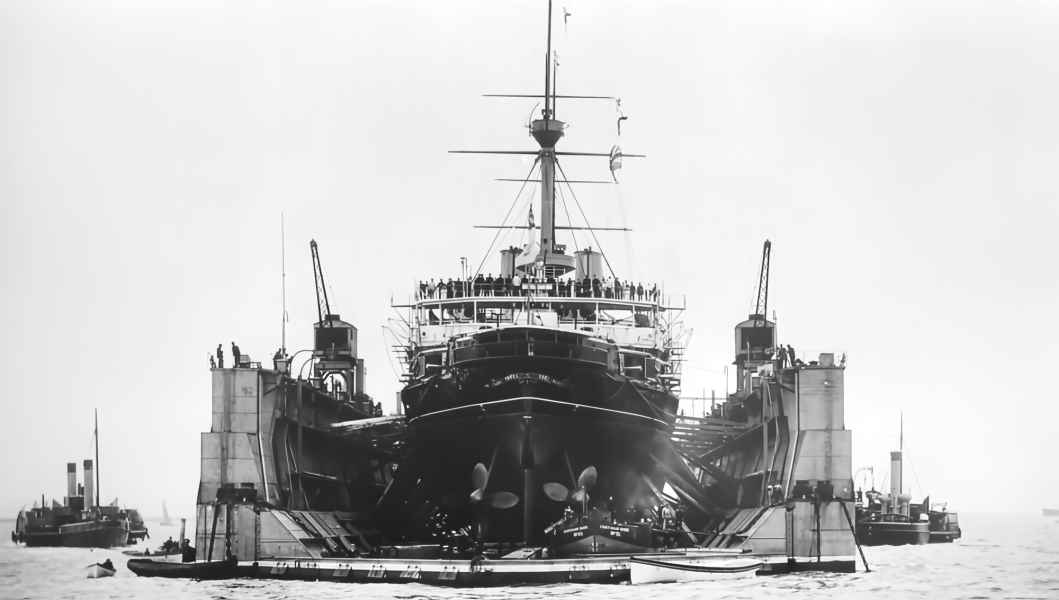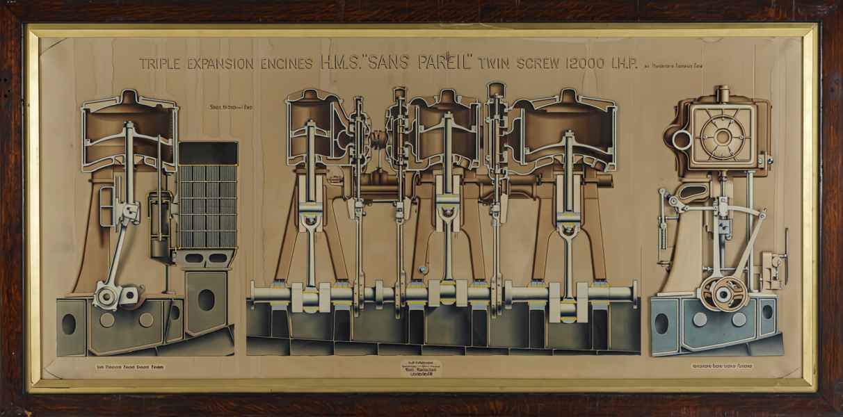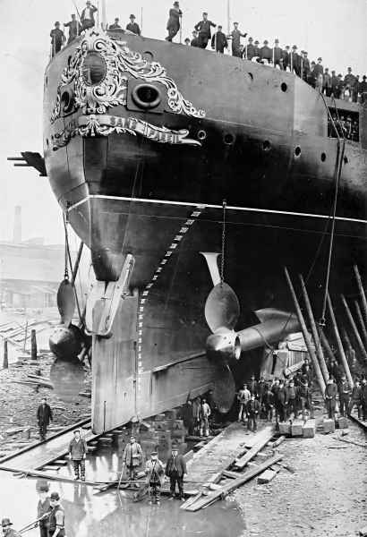 | Maszyny | Dwie 3-cylindrowe pionowe maszyny parowe o podwieszanych cylindrach potrójnego rozprężania firmy Humphreys, 8 kotłów cylindrycznych, 2 śruby |