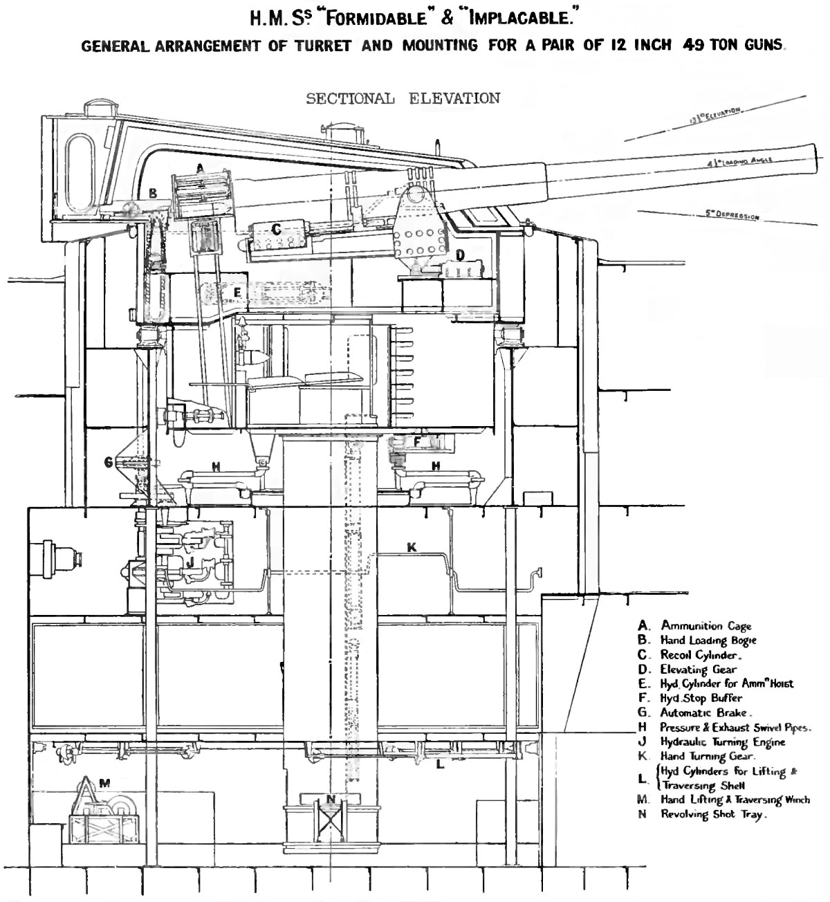Uzbrojenie składało się z 4 dział 305 mm (12 in)/40 Mk. IX RBL (2x2) , 12 dział 152 mm (6 in) QF (12x1), 16 dział 12-funtowych (12 pdr) QF (16x1), 6 dział 3-funtowych (3 pdr) QF (6x1) oraz 4 wyrzutni torped 457 mm (18 in). Wyrzutnie torped znajdowały się poniżej linii wodnej. Działa artylerii głównej były umieszczone w owalnych barbetach o grubości 305 mm (12 in). Za pancernym pasem burtowym grubość barbet zmniejszała się do połowy. Na barbetach znajdowały się w pełni zamknięte cytadele wieżowe (wieże) typu BVI, o grubości 203 mm (8 in) z tyłu, oraz 254 mm (10 in) na bokach. Z racji trudności w formowaniu kształtowych płyt pancernych ze stali Krupp'a, z którego wykonane były pancerze cytadeli działowej, były one płaskie na bokach. W odróżnieniu od poprzednich klas pancerników wyposażonych w działa 305 mm na okrętach klasy "FORMIDABLE" zastosowano działa odmiany Mk. IX o długości lufy 40 kalibrów w przeciwieństwie do dotychczas stosowanych 35 kalibrów. Zastosowano również dzielone windy amunicyjne, które ograniczały niebezpieczeństwo przedostania się ognia z wieży do magazynów amunicji. Dwudziałowe wieże artyleryjskie typu B. VI miały zakres podnoszenia dział od 13,5 (w górę), do 5 stopni (w dół).