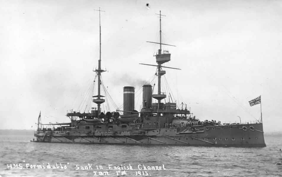 Pancerniki 5th Battle Squadron, pod dowództwem Vice-Admiral Commanding, Channel Fleet, Sir Lewis'a Bayly'a odbywały ćwiczenia artyleryjskie w pobliżu Isle of Portland, wspierane przez krążowniki HMS "TOPAZE" i HMS "DIAMOND". Po zakończeniu ćwiczeń flota pozostała w nocy na patrolu, mimo doniesień o aktywności okrętów podwodnych. Admirał Sir Lewis Bayly założył, iż przy wzburzonym morzu i zwiększającym się wietrze (a takie warunki panowały tej nocy) atak okrętu podwodnego miał małe szanse powodzenia i raczej nie stanowił zagrożenia. HMS "FORMIDABLE" zamykał szyk eskadry, płynąc z prędkością ok. 10 węzłów nieopodal Portland Bill, około 20 mil morskich od Start Point. Pancerniki szły w szyku torowym, nie zygzakując, zaś noc była jasna, księżycowa. O 2.20 torpeda wystrzelona z niemieckiego okrętu podwodnego "U 24" dowodzonego przez Rudolfa Schneidera trafiła w lewą burtę okrętu na wysokości przedziału kotłowni. Załoga sądziła iż uda się uratować okręt doprowadzając go do pobliskiego wybrzeża, jednak już o 02.40 przechył okrętu sięgnął 20° i dowódca okrętu, Captain Noel Loxley wydał rozkaz opuszczenia okrętu. Ciemności i pogarszająca się ciągle pogoda utrudniały akcję ratowniczą - wiele łodzi z pancernika uległo wywróceniu na wzburzonym morzu. Tymczasem "U 24" krążył wokół swojej zdobyczy. R. Schneider widząc, że HMS "FORMIDABLE" tonie zbyt wolno, zdecydował się na wykonanie kolejnego ataku. Celnie wystrzelona torpeda zadała kolejny cios pancernikowi o godzinie 3.35. Eksplozja tej torpedy, która uderzyła kadłub tym razem z lewej strony na wysokości drugiego komina, spowodowała w pięć sekund później serię trzech dalszych eksplozji i przypieczętowała los okrętu. O 04.45 pancernik przewrócił się do góry dnem, miażdżąc wielu rozbitków pływających w wodzie. Captain Loxley pozostał do końca na mostku wraz ze swoim psem Bruce'm, nadzorując akcję ratowniczą. Jeszcze nim pancernik zatonął, na miejscu katastrofy zjawił się krążownik HMS "TOPAZE". Z napotkanej szalupy zdjął 43 ludzi i oddalił się, otrzymawszy wiadomość, że w pobliżu dojrzano wynurzony okręt podwodny. Inny krążownik, HMS "DIAMOND", podniósł z wody 37 rozbitków. Rankiem 1 stycznia w czasie szalejącego sztormu trawler "PROVIDENT" z Brixham znalazł tonącą szalupę, w której znajdowało się 71 marynarzy z pancernika. Udało się szczęśliwie wszystkich ich uratować. Dalsze poszukiwania rozbitków spełzły na niczym. Inna szalupa, która początkowo miała na pokładzie 70 rozbitków po 22 godzinach dotarła do brzegu, jednak z jej załogi przeżyło jedynie 48 marynarzy. Łącznie z załogi pancernika zginęło 35 oficerów i 512 marynarzy z załogi liczącej 780 ludzi. Ciało psa Captain'a Loxley'a, Bruce'a zostało wyrzucone na brzeg i pochowane w oznaczonym grobie na cmentarzu Abbotsbury, w Dorset. Wrak HMS "FORMIDABLE" spoczywa na dnie kanału La Manche, na głębokości około 60 metrów, całkowicie odwrócony dnem do góry. W trakcie nielegalnych prób złomowania, pozbawiono go jednej ze śrub. HMS "FORMIDABLE" był trzecim zatopionym brytyjskim pancernikiem podczas I wojny światowej, w tym drugim który utracono w wyniku akcji nieprzyjaciela. Wrak okrętu znalazł się pod ochroną prawa przez zatwierdzenie "Protection of Military Remains Act 1986". |