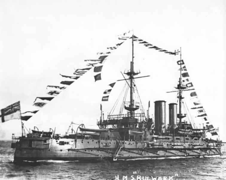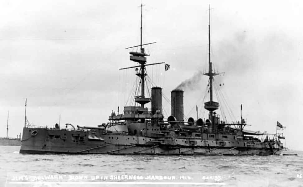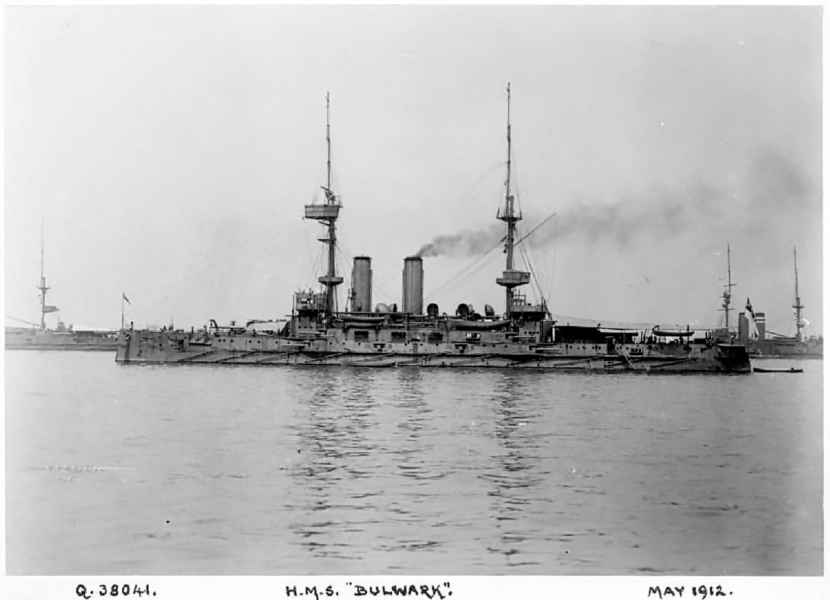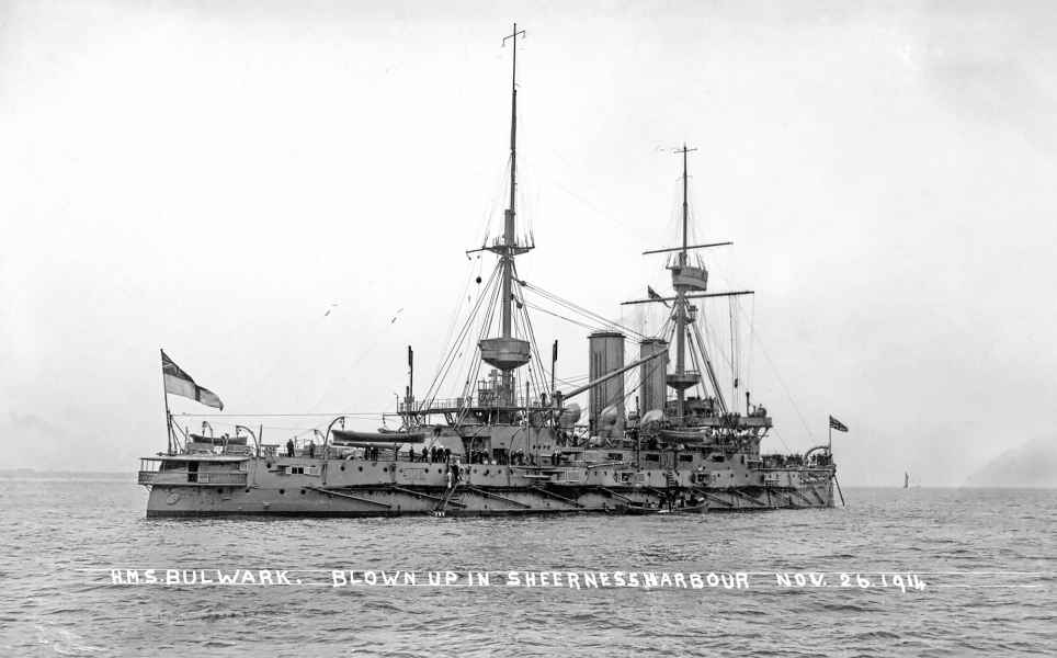 | 26.11.1914 | O godzinie 7.50. potężna eksplozja rozerwała HMS "BULWARK". Okręt w tym momencie był zacumowany przy boi 17 w Kethole Reach, 4 mile morskie na zachód od Sheerness, w ujściu rzeki Medway. Z 750 ludzi załogi przeżyło jedynie 14 marynarzy z których dwóch niedługo później zmarło. Pozostali byli ciężko poranieni. Jedyni którzy wyszli stosunkowo obronną ręką byli ci, którzy znajdowali się w momencie eksplozji w messie numer 1 i zostali wyrzuceni siłą eksplozji przez otwarty właz. Jeden z uratowanych marynarzy, Able Seaman Stephen Marshall wspomiał później że gdy eksplozja wyrzuciła go w górę wyraźnie widział trzęsące się czubki masztów pod sobą. |