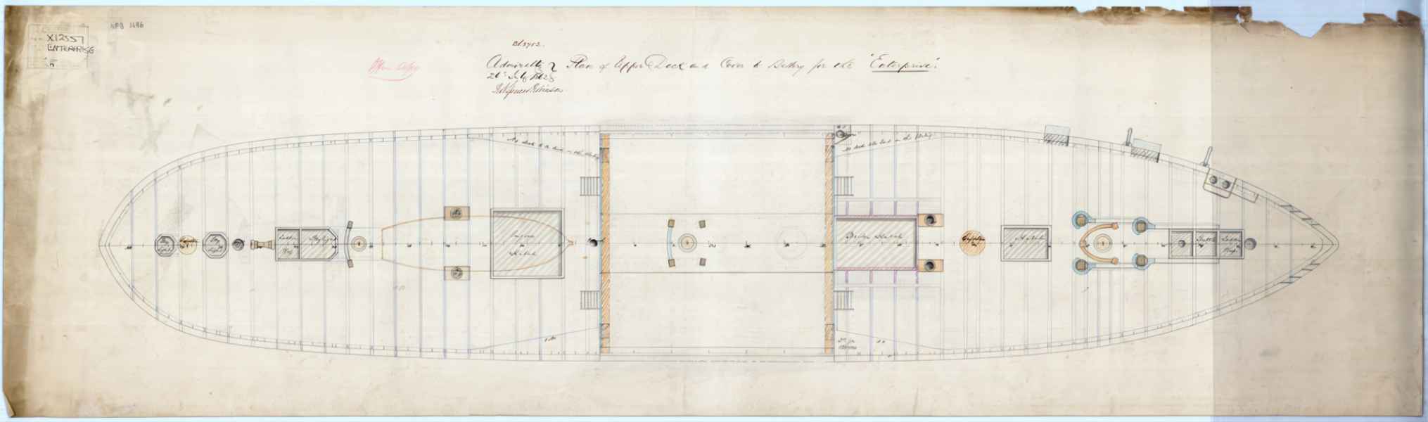 Rysunek konstrukcyjny górnego pokładu HMS "ENTERPRISE" datowany na 26 lipca 1862 r. z zasobów National Maritime Museum, Greenwich, Londyn.