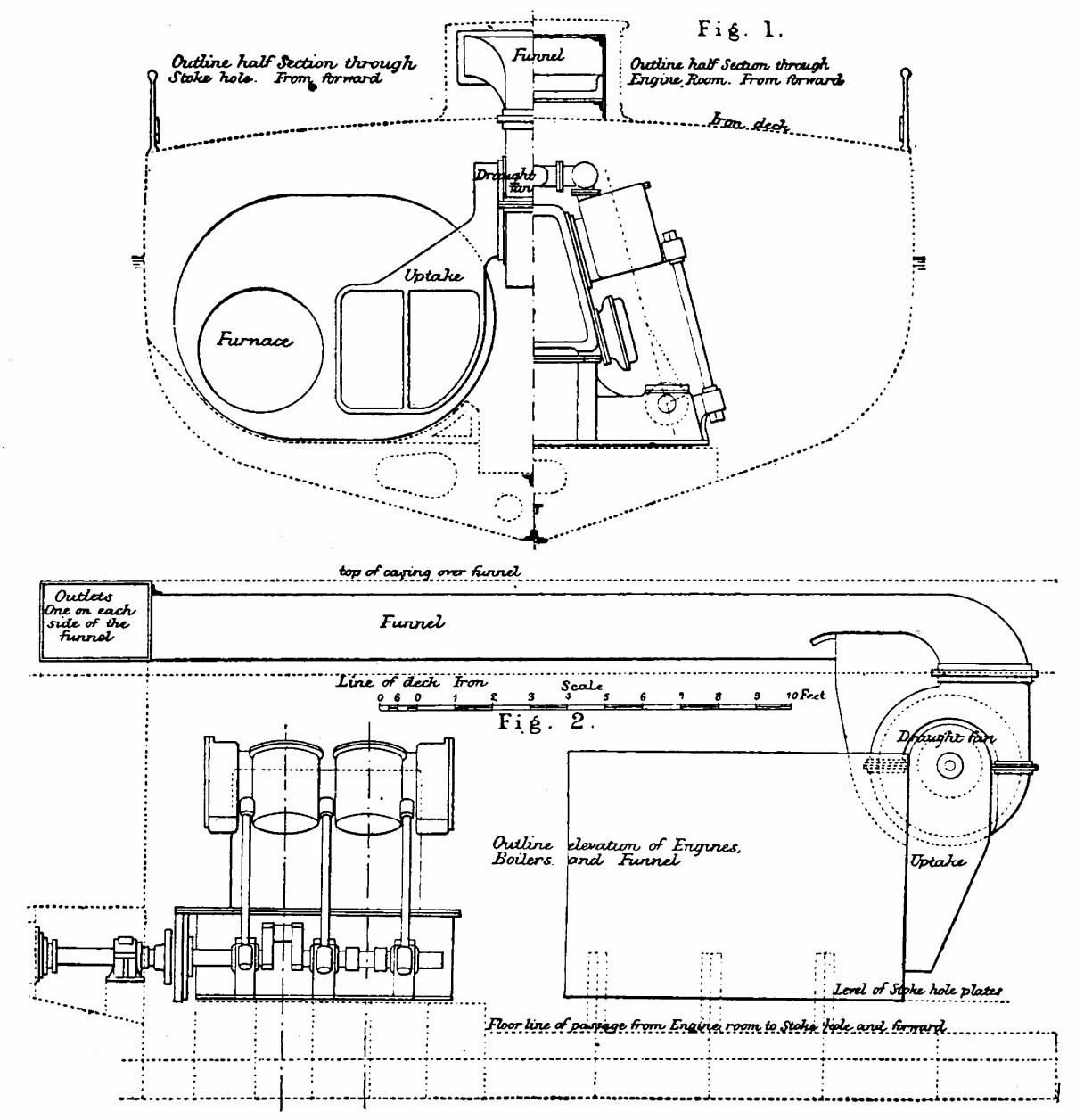 Okręt był napędzany dwiema 2-cylindrowymi maszynami parowymi bezpośredniego działania podwójnego rozprężania firmy Maudslay o skośnie ułożonych, odwróconych cylindrach o średnicy 0,56 m (22 in) i skoku 0,38 m (15 in) z pojedynczymi tłoczyskami i skraplaczem powierzchniowym. Skraplacz powierzchniowy, wspólny dla obu par silników, był umieszczony między nimi i odbierał nie tylko parę wydechową z głównych silników, ale także tę ze wszystkich licznych silników pomocniczych, w które wyposażona była jednostka. Tłoczyska i pręty zaworów suwakowych były wykonane ze stali, a nakrętki dławnic tłoczyska posiadały ząbkowanie, umożliwiające ich skręcenie razem. Na głównych wałach znajdowały się dwie pompy powietrza napędzane mimośrodami, po jednej na każdym wale. Dodatkowo w zespole silnikowym znajdowała się odśrodkowa pompa obiegowa napędzana przez osobny silnik. Do każdego z silników dopasowany był regulator Silvera. Moc z silników była przekazywana na dwie trzyłopatowe śruby systemu Griffitha o średnicy 1,98 m (6 ft 6 in), których osie były oddalone od siebie o 2,29 m (7 ft 6 in). Z godnie z posiadanymi informacjami planowano przeprowadzić również testy ze śrubami systemu Thornycrofta, jednakże nie ma pewności czy doszły one do skutku. Parę do silników dostarczały 2 kotły owalne, generujące parę o ciśnieniu roboczym do ok. 70 lbs/sq.ft. Kotły standardowo były wyposażone w zawory bezpieczeństwa w tym w dodatkowe małe zawory testowe obciążone ciężarkami. Para odpadowa z zaworów bezpieczeństwa była odprowadzana pod wodę, a do przewodu pary odpadowej dopasowane były zawory bezpieczeństwa - jeden zestaw otwierający się na zewnątrz ze sprężyną, a drugi do wewnątrz, nieobciążony, z wyjątkiem własnego ciężaru. Co niefortunne, pierwsze z nich znajdowały się niedaleko od przekładni rozruchowej i w przypadku gdyby podwodne zawory odpadowe zostałyby przypadkowo zamknięte, załoga maszynowni dosyć szybko zostałaby porażona przedostającą się z zaworów parą.Początkowo okręt nie posiadał żadnego komina. Produkty spalania z pieców były przenoszone przewodem wzdłuż i blisko górnego pokładu do punktu tuż za maszynownią, gdzie były wyprowadzane na zewnątrz przez otwory w ścianach przewodu. Aby utrzymać niezbędny ciąg dla kotłów, w zwykłym otworze dolotowym zamontowano wentylator napędzany jednym z trzycylindrowych silników Brotherhood & Hardingham, sprzężonym bezpośrednio z wrzecionem wentylatora. Dodatkowo na okręcie znajdowało się kilka silników pomocniczych. Dwa były przeznaczone do napędzania wentylatora ciągu, jeden to wspomniany już trzycylindrowy silnik; kolejny, rezerwowy silnik starszego typu, był gotowy do sprzęgnięcia z końcem wału wentylatora w przypadku awarii poprzedniego. Było to związane z tym, iż wentylator musiał być cały czas włączony, a silnik trzycylindrowy był w tamtym czasie nowością w Królewskiej Marynarce Wojennej i uznawano, iż w razie sytuacji awaryjnej niezbędne jest posiadanie zapasowej maszyny. Kolejny silnik pomocniczy był przeznaczony do napędzania wentylatora, wtłaczającego powietrze do różnych części okrętu, kolejny napędzał pompę wody do celów przeciwpożarowych. Dodatkowo na okręcie znajdowała się niewielka pompa zęzowa oraz oddzielny silnik do kolejny silnik do pompowania powietrza do zbiorników zasilających torpedę.